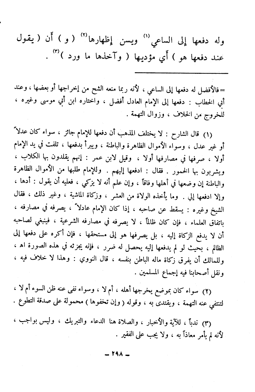 (¬1) قال الشارح: لا يختلف المذهب أن دفعها للإمام جائز، سواء كان عدلاً أو غير عدل، وسواء الأموال الظاهرة والباطنة، ويبرأ بدفعها، تلفت في يد الإمام أو لا، صرفها من مصارفها أو لا، وقيل لابن عمر: إنهم يقلدون بها الكلاب، ويشربون بها الخمر. فقال: ادفعها إليهم، وللإمام طلبها من الأموال الظاهرة والباطنة إن وضعها في أهلها وفاقًأ وإن علم أنه لا يزكي، فعليه أن يقول: أدها، وإلا ادفعها إلي. وما يأخذه الولاة من العشر، وزكاة الماشية، وغير ذلك، فقال الشيخ وغيره: يسقط عن صاحبه، إذا كان الإمام عادلاً، يصرفه في مصارفه، باتفاق العلماء، فإن كان ظالمًا، لا يصرفه في مصارفه الشرعية، فينبغي لصاحبه أن لا يدفع الزكاة إليه، بل يصرفها هو إلى مستحقها، فإن أكره على دفعها إلى الظالم، بحيث لو لم يدفعها إليه يحصل له ضرر، فإنه يجزئه في هذه الصورة. اهـ. وللمالك أن يفرق زكاة ماله الباطن بنفسه، قال النووي: وهذا لا خلاف فيه، ونقل أصحابنا فيه إجماع المسلمين.