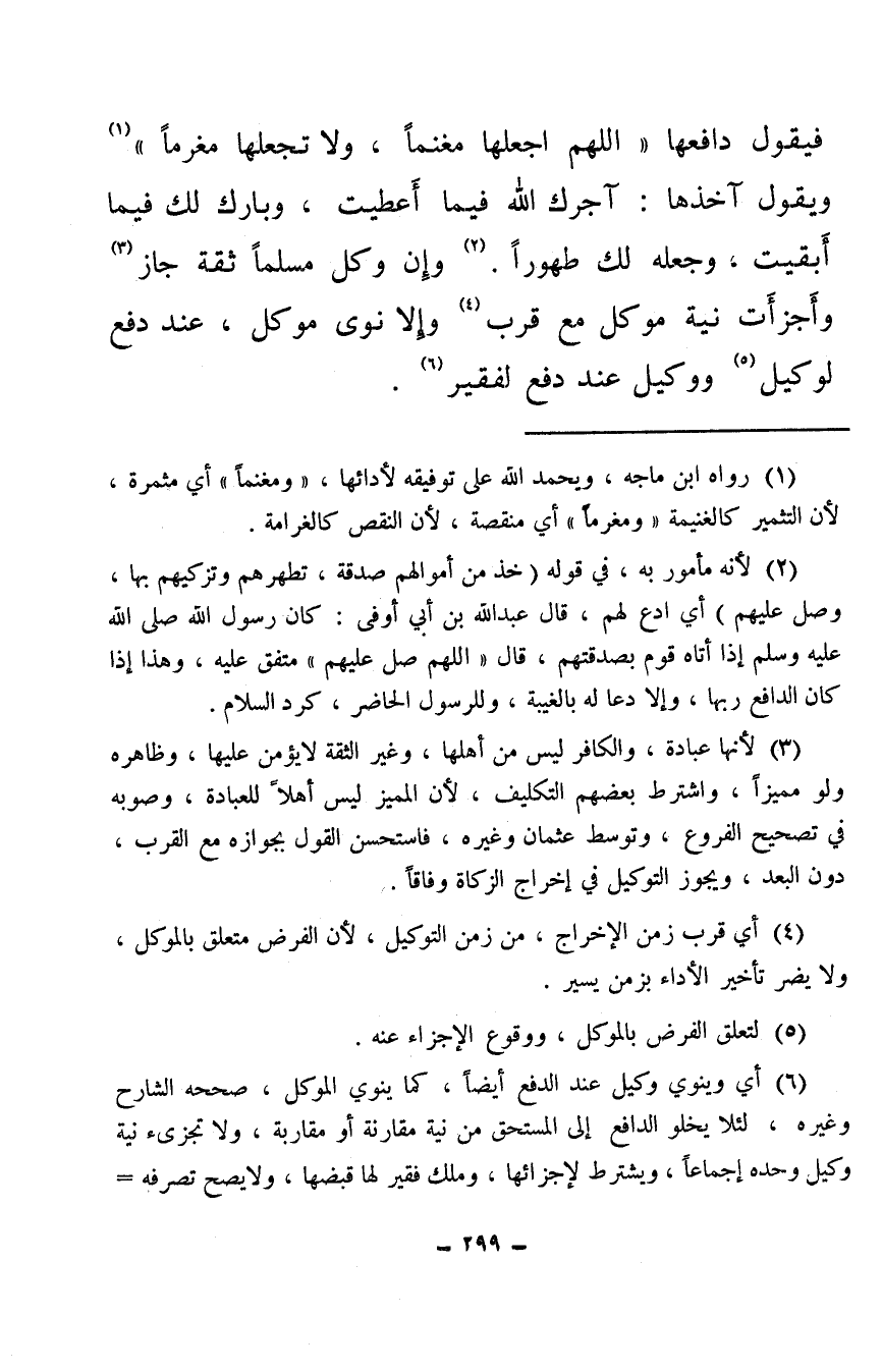 (¬2) لأنه مأمور به في قوله {خُذْ مِنْ أَمْوَالِهِمْ صَدَقَةً تُطَهِّرُهُمْ وَتُزَكِّيهِمْ بِهَا وَصَلِّ عَلَيْهِمْ} أي ادع لهم، قال عبد الله بن أوفى: كان رسول الله صلى الله عليه وسلم إذا أتاه قوم بصدقتهم، قال «اللهم صل عليهم» متفق عليه، وهذا إذا كان الدافع ربها، وإلا دعا له بالغيبة، وللرسول الحاضر، كرد السلام.