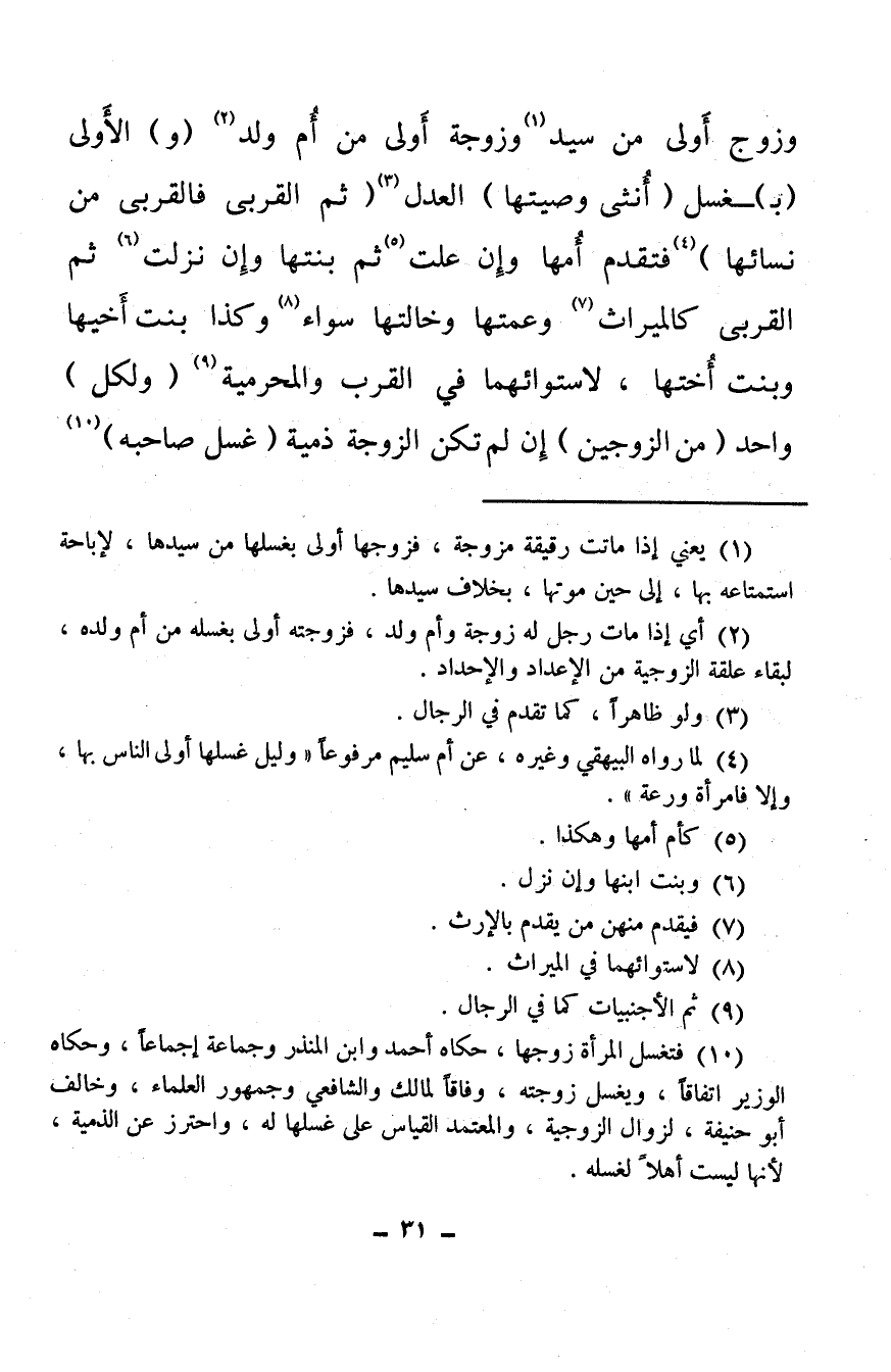 (¬7) للخروج من الخلاف في تغسيلهما الزوج والسيد، لكن قال النووي وغيره: إنما هي رواية عن أحمد، فإن ثبتت فمحجوج بالإجماع. اهـ. وأكثر الأصحاب لم يذكروا هذه الرواية عنه رحمهم الله، منهم القاضي والشريف، وأبو الخطاب والشيرازي وغيرهم.