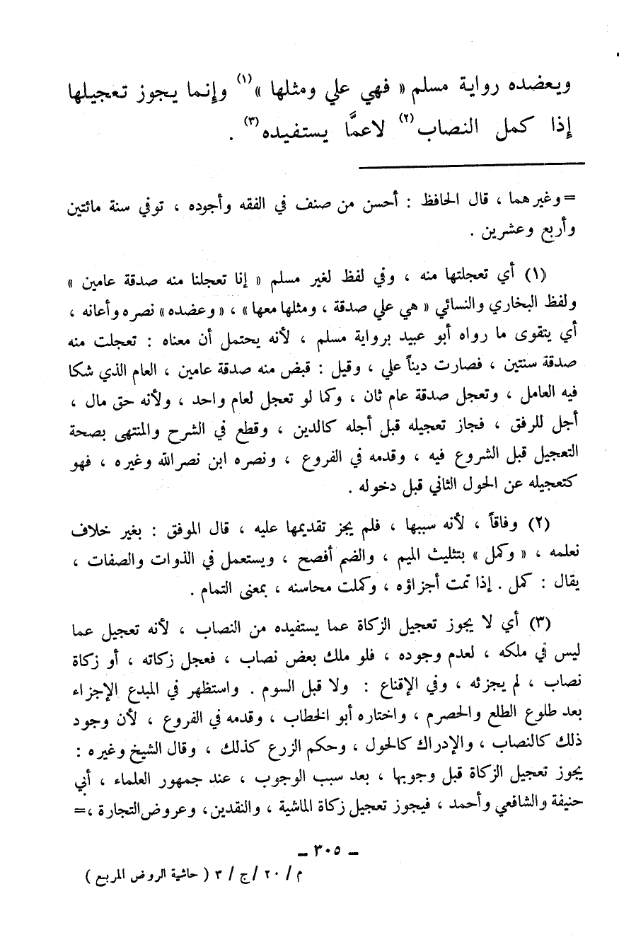 (¬1) أي تعجلتها منه، وفي لفظ غير مسلم «إنا تعجلنا منه صدقة عامين» ولفظ البخاري والنسائي «هي على صدقة، ومثلها معها» ، «وعضده» نصره وأعانه، أي يتقوى ما رواه أبو عبيد برواية مسلم، لأنه يحتمل أن معناه: تعجلت منه صدقة سنتين، فصارت دينًا علي، وقيل: قبض منه صدقة عامين، العام الذي شكا فيه العامل، وتعجل صدقة عام ثان، وكما لو تعجل لعام واحد، ولأنه حق مال، أجل للرفق، فجاز تعجيله قبل أجله كالدين، وقطع في الشرح والمنتهى بصحة التعجيل قبل الشروع فيه، وقدمه في الفروع، ونصره ابن نصر الله وغيره، فهو كتعجيله عن الحول الثاني قبل دخوله.
