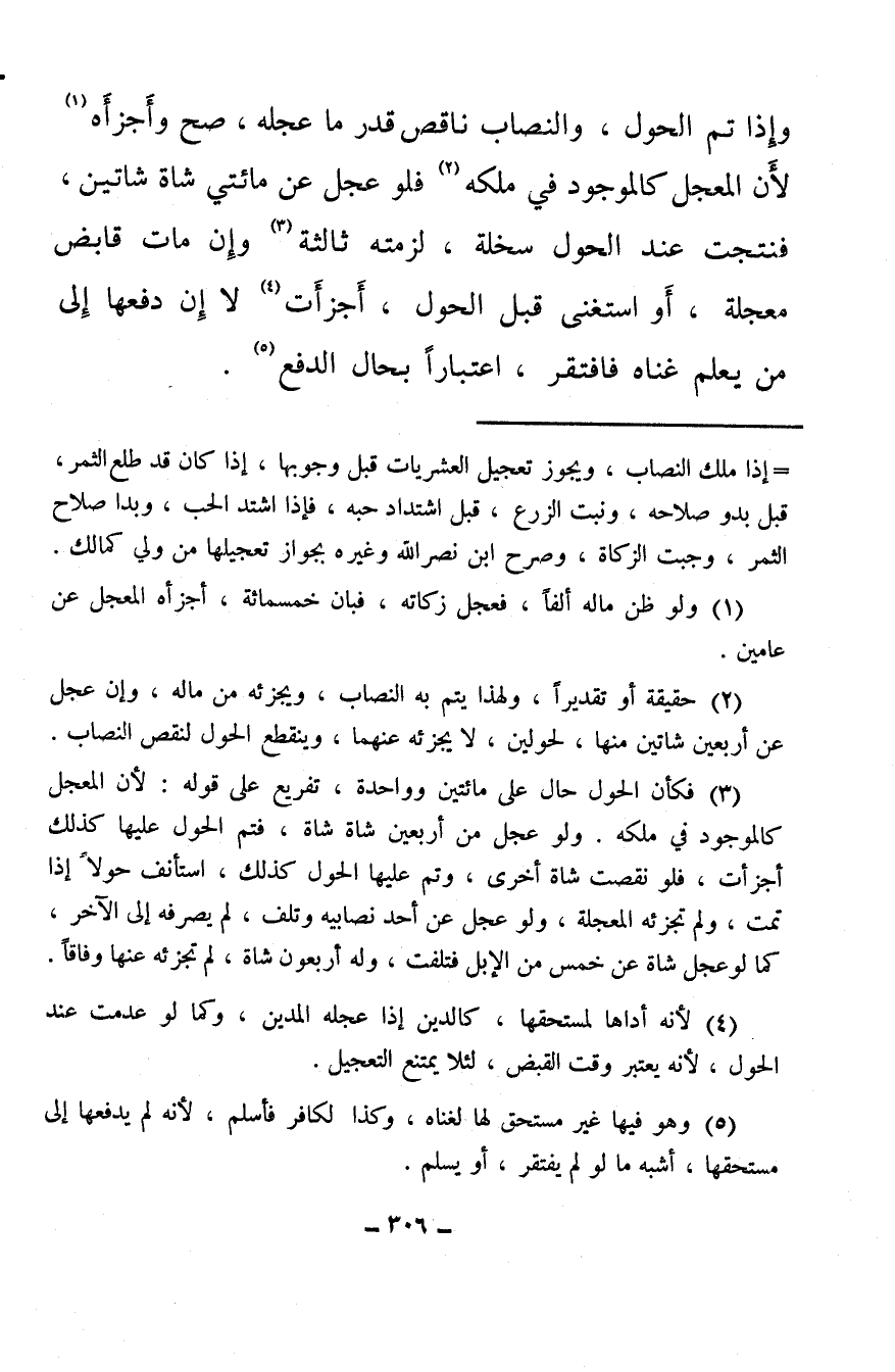 (¬3) فكأن الحول حال على مائتين وواحدة، تفريع على قوله: لأن المعجل كالموجود في ملكه. ولو عجل من أربعين شاة شاة، فتم الحول عليها كذلك أجزأت، فلو نقصت شاة أخرى، وتم عليها الحول كذلك، استأنف حولاً إذا تمت، ولو تجزئه المعجلة، ولو عجل عن أحد نصابيه وتلف، لم يصرفه إلى الآخر، كما لو عجل شاة عن خمس من الإبل فتلفت، وله أربعون شاة، لم تجزئه عنها وفاقًا.