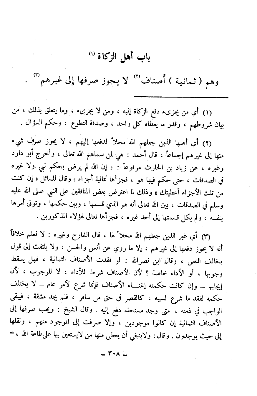 (¬3) أي غير الذين جعلهم الله محلاً لها، قال الشارح وغيره: لا نعلم خلافًا أنه لا يجوز دفعها إلى غيرهم، إلا ما روي عن أنس والحسن، ولا يلتفت إلى قول يخالف النص، وقال ابن نصر الله: لو فقدت الأصناف الثمانية، فهل يسقط وجوبها، أو الأداء خاصة؟ لأن الأصناف شرط للأداء، لا للوجوب، لأن إيجابها – وإن كانت حكمته إغناء الأصناف فإنما شرع لأمر عام – لا يختلف حكمه لفقد ما شرع لسببه، كالقصر في حق من سافر، فلم يجد مشقة، فيبقى الواجب في ذمته، متى وجد مستحقه دفع إليه. وقال الشيخ: ويجب صرفها إلى الأصناف الثمانية إن كانوا موجودين، وإلا صرفت إلى الموجود منهم، ونقلها إلى حيث يوجدون. وقال: ولا ينبغي أن يعطى منها من لا يستعين بها على طاعة الله، فإن الله فرضها معونة على طاعته، لمن يحتاج إليها من المؤمنين، أو من يعاونهم، فمن لا يصلي من أهل الحاجات لا يعطى منها، حتى يتوب، ويلتزم أداء الصلاة.