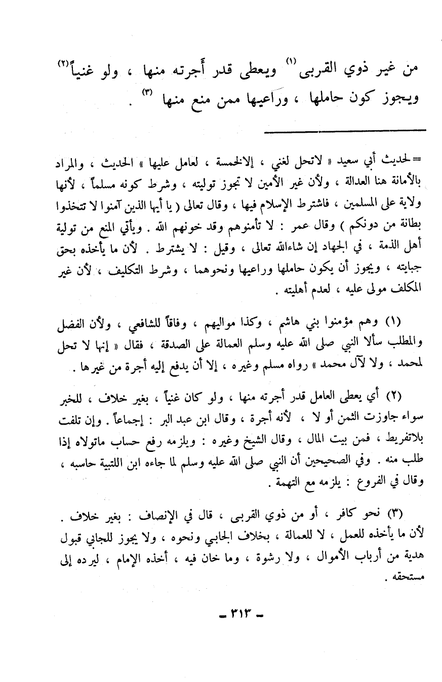(¬3) نحو كافر، أو من ذوي القربى، قال في الإنصاف: بغير خلاف. لأن ما يأخذه للعمل، لا للعمالة، بخلاف الجابي ونحوه، ولا يجوز للجابي قبول هدية من أرباب الأموال، ولا رشوة، وما خان فيه، أخذه الإمام، ليرده إلى مستحقه.