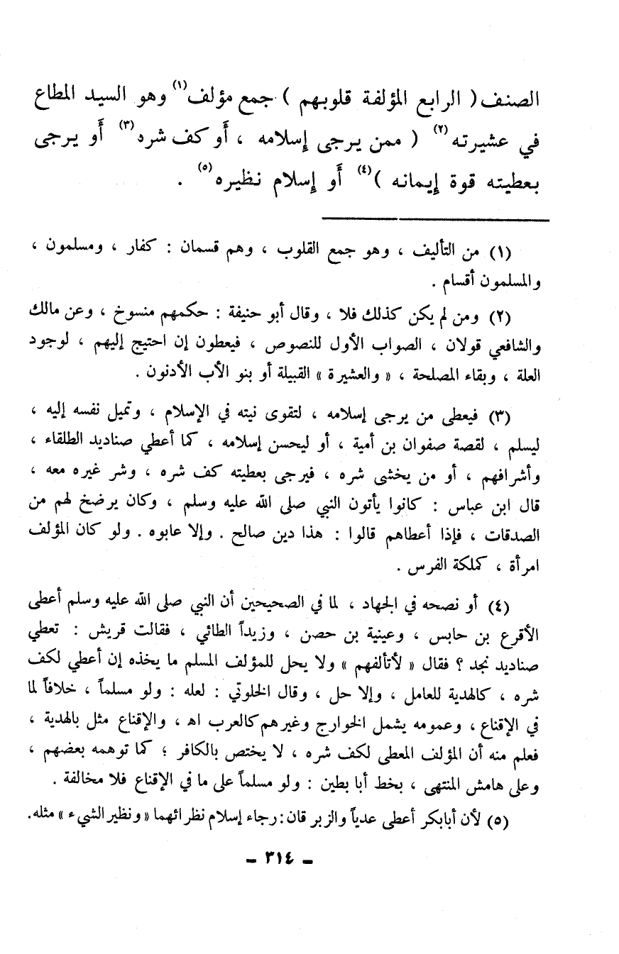 (¬3) فيعطى من يرجى إسلامه، لتقوى نيته في الإسلام، وتميل نفسه إليه، ليسلم، لقصة صفوان بن أمية’ أو ليحسن إسلامه، كما أعطى صناديد الطلقاء، وأشرافهم، أو من يخشى شره، فيرجى بعطيته كف شره، وشر غيره معه، قال ابن عباس: كانوا يأتون النبي صلى الله عليه وسلم، وكان يرضخ لهم من الصدقات، فإذا أعطاهم قالوا: هذا دين صالح. وإلا عابوه. ولو كان المؤلف امرأة، كملكة الفرس.