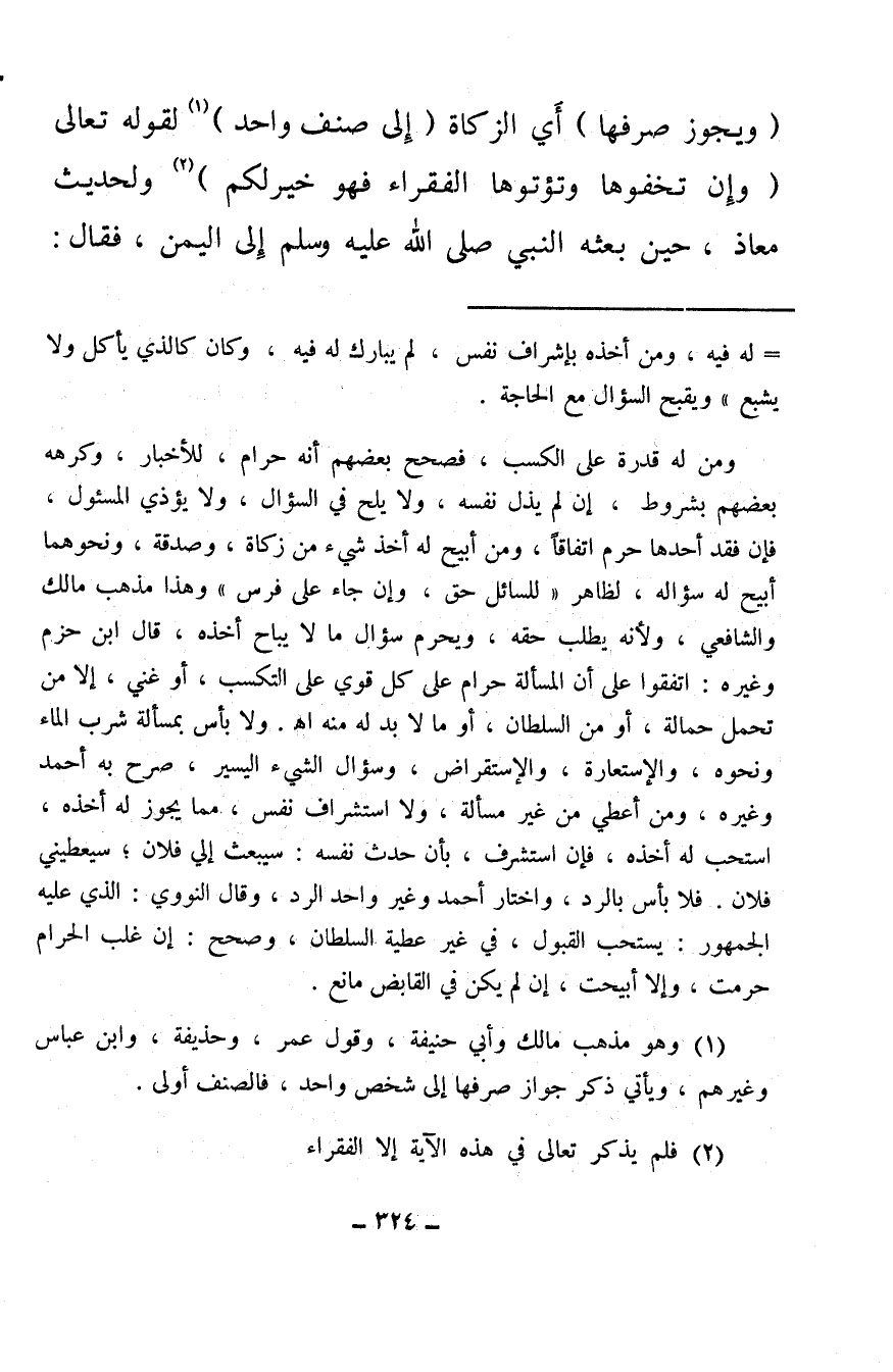 (ويجوز صرفها) أي الزكاة (إلى صنف واحد) (¬1) لقوله تعالى {وَإِنْ تُخْفُوهَا وَتُؤْتُوهَا الْفُقَرَاءَ فَهُوَ خَيْرٌ لَكُمْ} (¬2) ولحديث معاذ، حين بعثه النبي صلى الله عليه وسلم إلى اليمن، فقال: