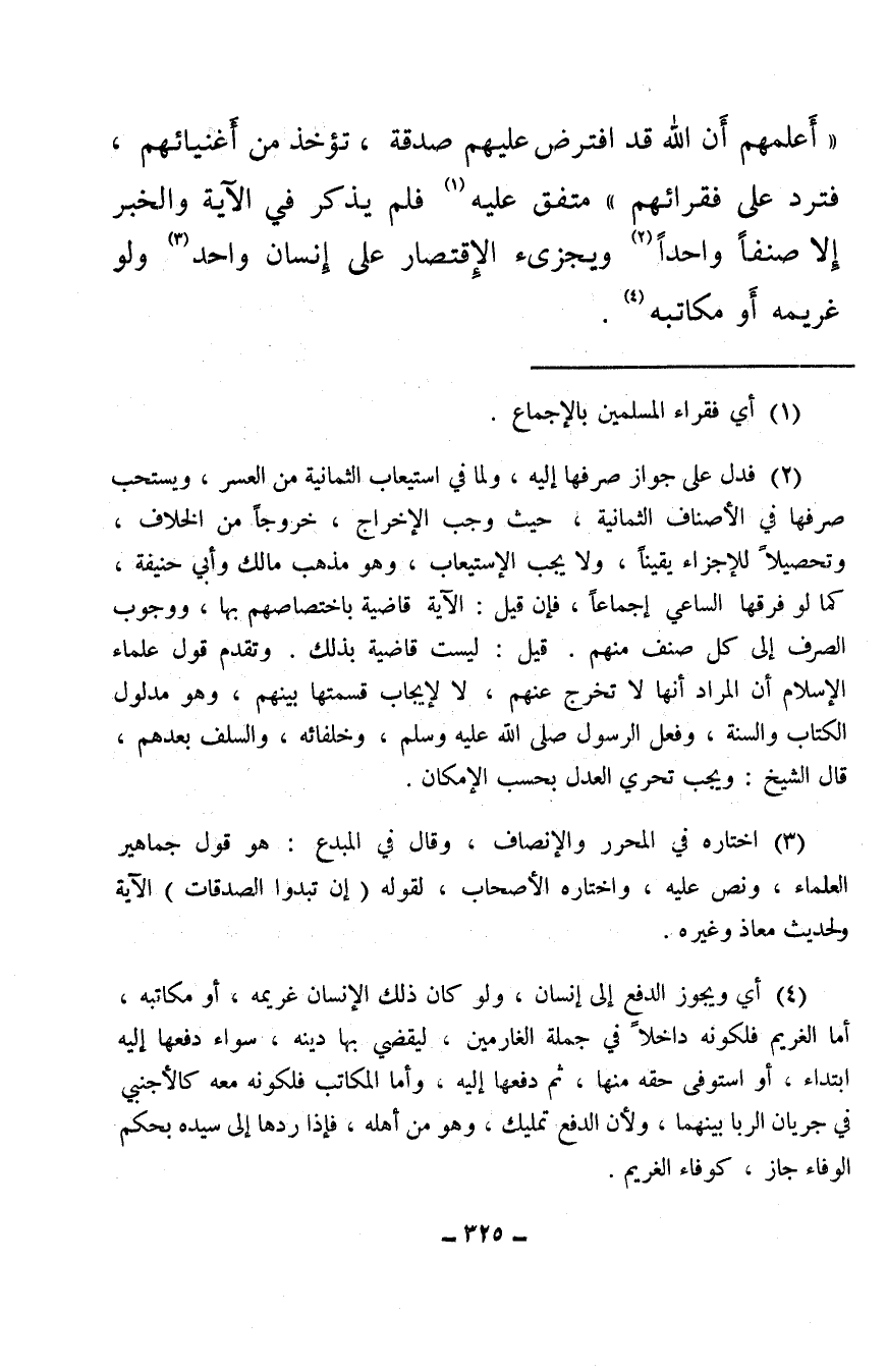 «أَعلمهم أَن الله قد افترض عليهم صدقة، تؤخذ من أَغنيائهم، فترد على فقرائهم» متفق عليه (¬1) فلم يذكر في الآية والخبر إلا صنفًا واحدًا (¬2) ويجزئ الاقتصار على إنسان واحد (¬3) ولو غريمه أَو مكاتبه (¬4) .