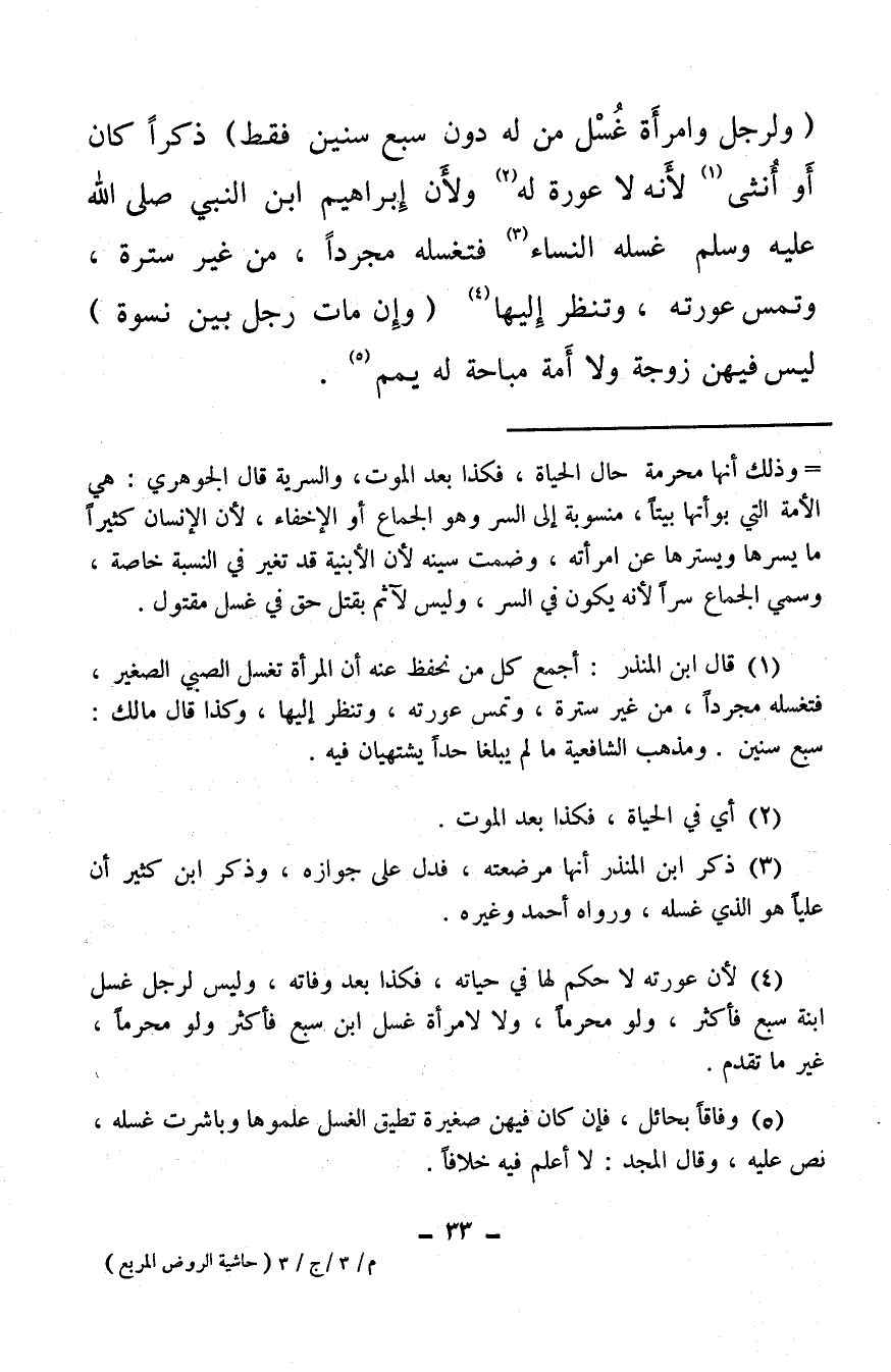 (¬4) لأن عورته لا حكم لها في حياته، فكذا بعد وفاته، وليس لرجل غسل ابنة سبع فأكثر، ولو محرمًا، ولا لامرأة غسل ابن سبع فأكثر ولو محرمًا، غير ما تقدم.
