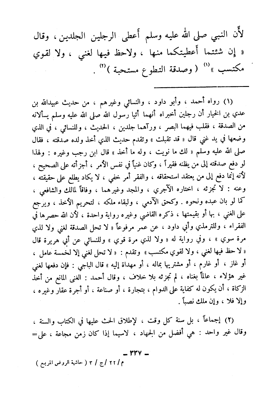 (¬1) رواه أحمد، وأبو داود، والنسائي وغيرهم، من حديث عبيد الله بن عدي بن الخيار أن رجلين أخبراه أنهما أتيا رسول الله صلى الله عليه وسلم يسألانه من الصدقة، فقلب فيهما البصر، ورآهما جلدين، الحديث، وللنسائي، في الذي وضعها في يد غني قال «قد تقبلت» وتقدم حديث الذي أخذ ولده صدقته، فقال صلى الله عليه وسلم «لك ما نويت، وله ما أخذ» قال ابن رجب وغيره: ولهذا لو دفع صدقته إلى من يظنه فقيرًا، وكان غنيًا في نفس الأمر، أجزأته على الصحيح، لأنه إنما دفع إلى من يعتقد استحقاقه، والفقر أمر خفي، لا يكاد يطلع على حقيقته، وعنه: لا تجزئه، اختاره الآجري، والمجد وغيرهما، وفاقًا لمالك والشافعي، كما لو بان عبده ونحوه. وكحق الآدمي، ولبقاء ملكه، لتحريم الأخذ، ويرجع على الغني، بها أو بقيمتها ذكره القاضي وغيره رواية واحدة، لأن الله حصرها في الفقراء، وللترمذي وأبي داود، عن عمر مرفوعًا «لا تحل الصدقة لغني ولا للذي مرة سوي» ، وفي رواية له «ولا لذي مرة قوي» وللنسائي عن أبي هريرة قال «لاحظ فيها لغني، ولا لقوي مكتسب» وتقدم: «لا تحل لغني إلا لخمسة عامل، أو غاز، أو غارم، أو مشتريها بماله، أو مهداة إليه» قال الباجي: فإن دفعها لغني غير هؤلاء، عالمًا بغناه، لم تجزئه بلا خلاف، وقال أحمد: الغني المانع من أخذ الزكاة، أن يكون له كفاية على الدوم، بتجارة، أو صناعة، أو أجرة عقار وغيره، وإلا فلا، وإن ملك نصبًا.