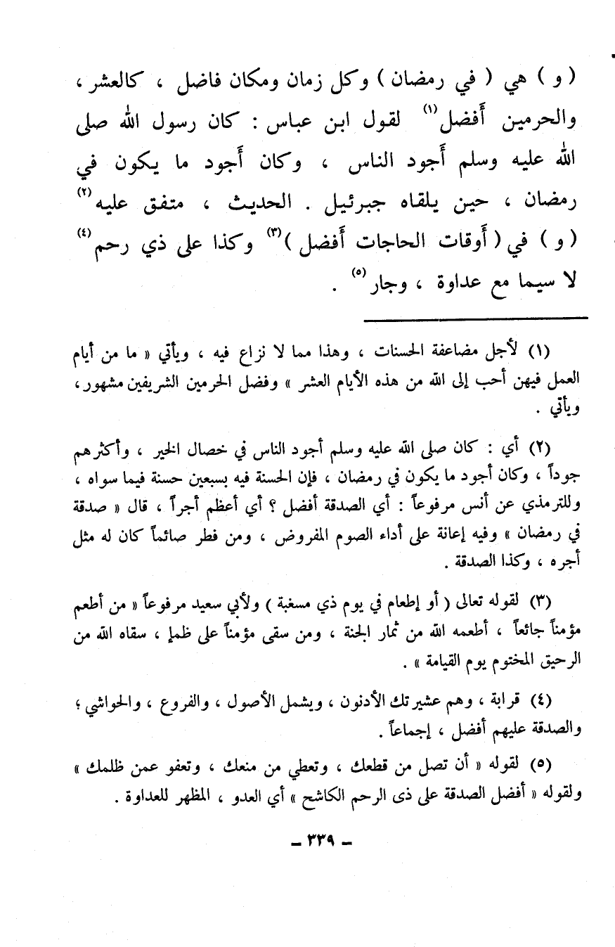 (و) هي (في رمضان) وكان زمان ومكان فاضل، كالعشر، والحرمين أَفضل (¬1) لقول ابن عباس: كان رسول الله صلى الله عليه وسلم أَجود الناس، وكان أَجود ما يكون في رمضان، حين يلقاه جبرئيل. الحديث، متفق عليه (¬2) (و) في (أوقات الحاجات أفضل) (¬3) وكذا على ذي رحم (¬4) لا سيما مع عداوة، وجار (¬5) .