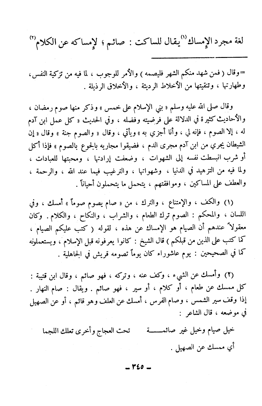 (¬1) والكف، والامتناع، والترك، من «صام يصوم صومًا» أمسك، وفي اللسان، والمحكم: الصوم ترك الطعام، والشراب، والنكاح، والكلام. وكان معقولاً عندهم أن الصيام هو الإمساك عن هذه، لقوله {كُتِبَ عَلَيْكُمُ الصِّيَامُ كَمَا كُتِبَ عَلَى الَّذِينَ مِنْ قَبْلِكُمْ} قال الشيخ: كانوا يعرفونه قبل الإسلام، ويستعملونه كما في الصحيحين: يوم عاشوراء كان يومًا تصومه قريش في الجاهلية.