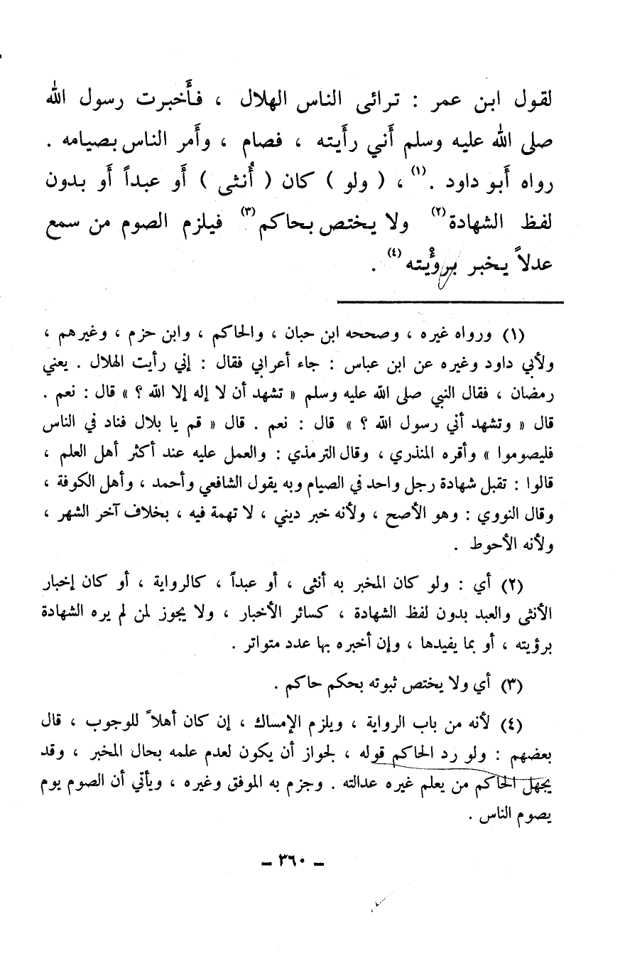 (¬1) ورواه غيره، وصححه ابن حبان، والحاكم، وابن حزم، وغيرهم، ولأبي داود وغيره عن ابن عباس: جاء أعرابي فقال: إني رأيت الهلال. يعني رمضان، فقال النبي صلى الله عليه وسلم «تشهد أن لا إله إلا الله؟» قال: نعم. قال «وتشهد أني رسول الله؟» قال: نعم. قال «قم يا بلال فناد في الناس فليصوموا» وأقره المنذري، وقال الترمذي: والعمل عليه عند أكثر أهل العلم، قالوا: تقبل شهادة رجل واحد في الصيام وبه يقول الشافعي وأحمد، وأهل الكوفة، وقال النووي: وهو الأصح، ولأنه خبر ديني، لا تهمة فيه، بخلاف آخر الشهر، ولأنه الأحوط.