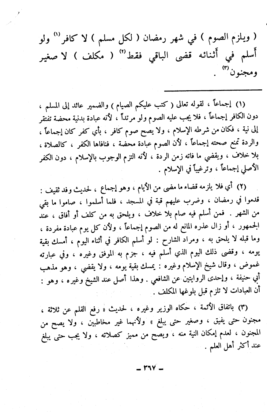 (¬1) إجماعًا، لقوله تعالى {كُتِبَ عَلَيْكُمُ الصِّيَامُ} والضمير عائد إلى المسلم، دون الكافر إجماعًا، فلا يجب عليه الصوم ولو مرتدًا، لأنه عبادة بدنية محضة تفتقر إلى نية، فكان من شرطه الإسلام، ولا يصح صوم كافر، بأي كفر كان إجماعًا، والردة تمنع صحته إجماعًا، لأن الصوم عبادة محضة، فنافاها الكفر، كالصلاة، بلا خلاف، ويقضي ما فاته زمن الردة، لأنه التزم الوجوب بالإسلام، دون الكفر الأصلي إجماعًا، وترغيبًا في الإسلام.