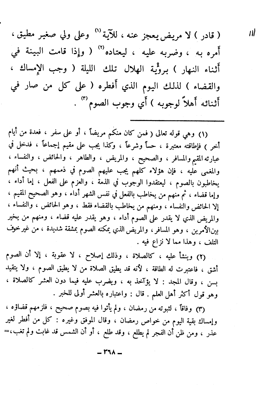 (¬1) وهي قوله تعلى {فَمَنْ كَانَ مِنْكُمْ مَرِيضًا أَوْ عَلَى سَفَرٍ فَعِدَّةٌ مِنْ أَيَّامٍ أُخَرَ} فإطاقته معتبرة، حسًا وشرعًا، وكذا يجب على مقيم إجماعًا، فدخل في عبارته المقيم والمسافر، والصحيح، والمريض، والطاهر، والحائض، والنفساء، والمغمى عليه، فإن هؤلاء كلهم يجب عليهم الصوم في ذممهم، بحيث أنهم يخاطبون بالصوم، ليعتقدوا الوجوب في الذمة، والعزم على الفعل، إما أداء، وإما قضاء، ثم منهم من يخاطب بالفعل في نفس الشهر أداء، وهو الصحيح المقيم، إلا الحائض والنفساء، ومنهم من يخاطب بالقضاء فقط، وهو الحائض، والنفساء، والمريض الذي لا يقدر على الصوم أداء، وهو يقدر عليه قضاء، ومنهم من يخير بين الأمرين، وهو المسافر، والمريض الذي يمكنه الصوم بمشقة شديدة، من غير خوف التلف، وهذا مما لا نزاع فيه.
