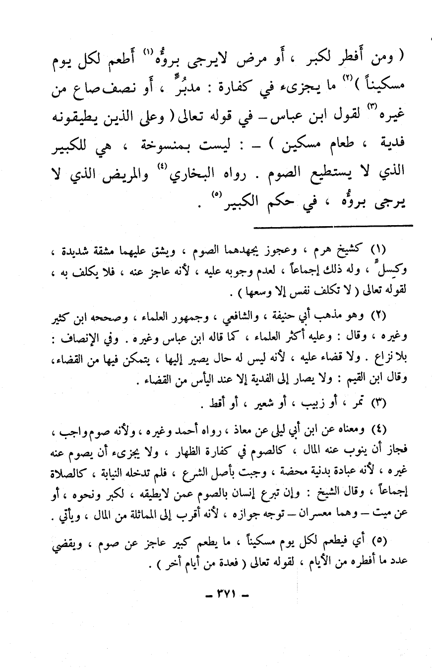 (ومن أفطر لكبر، أو مرض لا يرجى برؤُه (¬1) أطعم لكل يوم مسكينًا) (¬2) ما يجزئ في كفارة: مدبُرًّ، أو نصف صاع من غيره (¬3) لقول ابن عباس – في قوله تعالى {وَعَلَى الَّذِينَ يُطِيقُونَهُ فِدْيَةٌ طَعَامُ مِسْكِينٍ} -: ليست بمنسوخة، هي للكبير الذي لا يستطيع الصوم. رواه البخاري (¬4) والمريض الذي لا يرجى برؤُه، في حكم الكبير (¬5) .