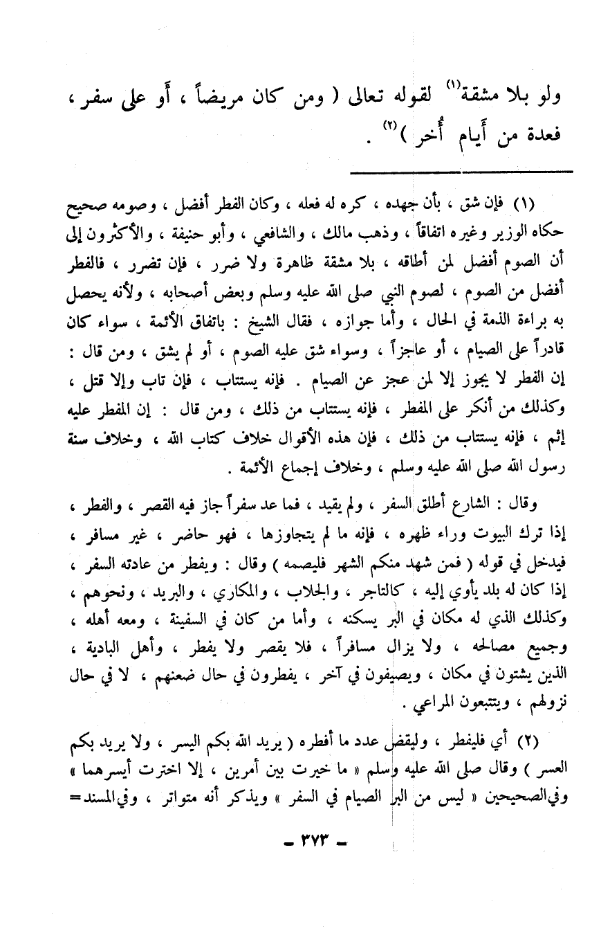 (¬1) فإن شق، بأن جهده، كره له فعله، وكان الفطر أفضل، وصومه صحيح حكاه الوزير وغيره اتفاقًا، وذهب مالك، والشافعي، وأبو حنيفة، والأكثرون إلى أن الصوم أفضل لمن أطاقه، بلا مشقة ظاهرة ولا ضرر، فإن تضرر، فالفطر أفضل من الصوم، لصوم النبي صلى الله عليه وسلم وبعض أصحابه، ولأنه يحصل به براءة الذمة في الحال، وأما جوازه، فقال الشيخ: باتفاق الأئمة، سواء كان قادرًا على الصيام، أو عاجزًا، وسواء شق عليه الصوم، أو لم يشق، ومن قال: إن الفطر لا يجوز إلا لمن عجز عن الصيام. فإنه يستتاب، فإن تاب وإلا قتل، وكذلك من أنكر على المفطر، فإنه يستتاب من ذلك، ومن قال: إن المفطر عليه إثم، فإنه يستتاب من ذلك، فإن هذه الأقوال خلاف كتاب الله، وخلاف سنة رسول الله صلى الله عليه وسلم، وخلاف إجماع الأئمة.