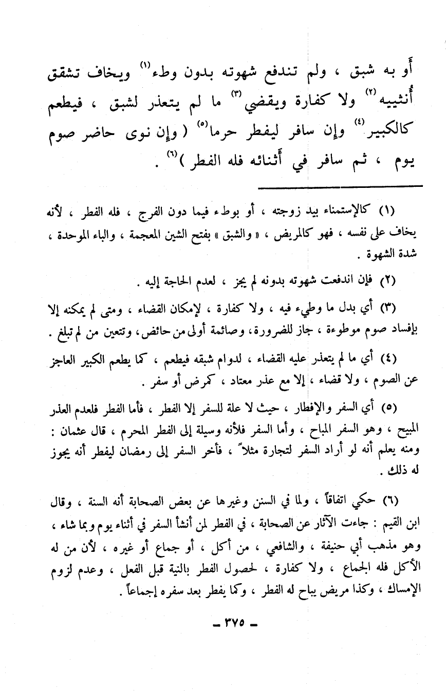 (¬1) كالإستمناء بيد زوجته، أو بوطء فيما دون الفرج، فله الفطر، لأنه يخاف على نفسه، فهو كالمريض، «والشبق» بفتح الشين المعجمة، والباء الموحدة، شدة الشهوة.