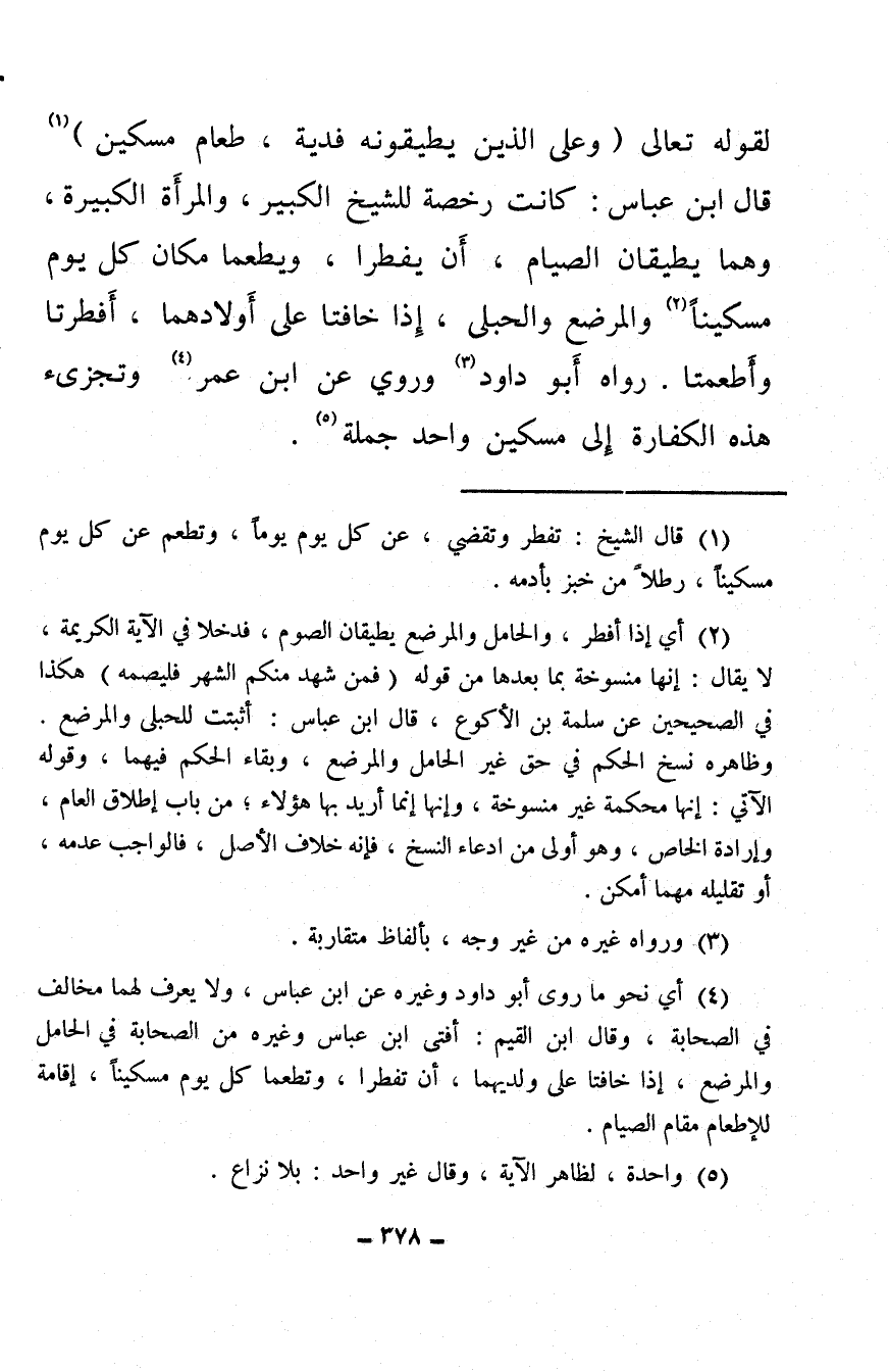 (¬4) أي نحو ما روى أبو داود وغيره عن ابن عباس، ولا يعرف لهما مخالف في الصحابة، وقال ابن القيم: أفتى ابن عباس وغيره من الصحابة في الحامل والمرضع، إذا خافتا على ولديهما، أن تفطرا، وتطعما كل يوم مسكينًا، إقامة للإطعام مقام الصيام.