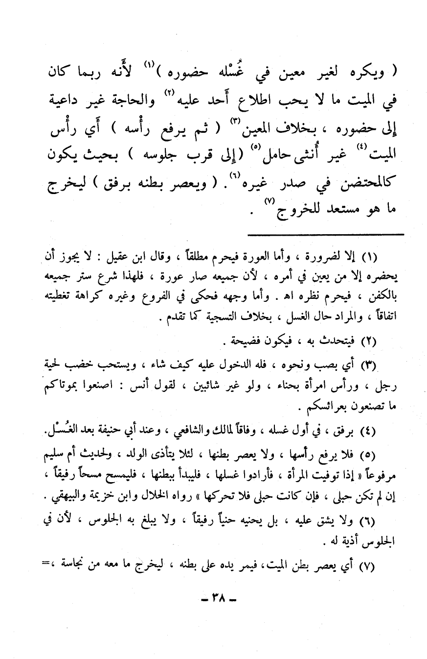 (¬1) إلا لضرورة، وأما العورة فيحرم مطلقًا، وقال ابن عقيل: لا يجوز أن يحضره إلا من يعين في أمره، لأن جميعه صار عورة، فلهذا شرع ستر جميعه بالكفن، فيحرم نظره. اهـ.