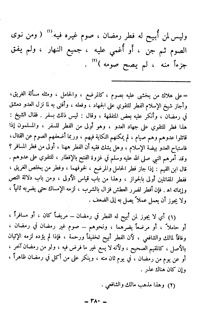 (¬1) أي لا يجوز لمن أبيح له الفطر في رمضان – مريضًا كان، أو مسافرًا، أو حاملاً، أو مرضعًا يضرهما، ونحوهم – صوم غير رمضان في رمضان، وفاقًا لمالك والشافعي، لأن الفطر أبيح تخفيفًا ورحمة، فإذا لم يؤده لزمه الإتيان بالأصل، كالمقيم الصحيح، ولأنه لا يسع غير ما فرض فيه، ولو من رمضان آخر، أو عن يوم من رمضان، في يوم ثان منه، وينكر على من أكل في رمضان ظاهرًا، وإن كان هناك عذر.
