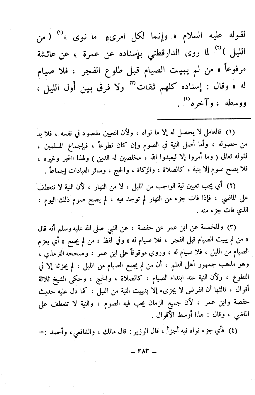 (¬3) وللخمسة عن ابن عمر عن حفصة، عن النبي صلى الله عليه وسلم أنه قال: «من لم يبيت الصيام قبل الفجر، فلا صيام له» وفي لفظ «من لم يجمع» أي يعزم الصيام من الليل، فلا صيام له، وروي موقوفًا على ابن عمر، وصححه الترمذي، وهو مذهب جمهور أهل العلم، أن من لم يجمع الصيام من الليل، لم يجزئه إلا في التطوع، ولأن النية عند ابتداء الصيام، كالصلاة، والحج، وحكى الشيخ ثلاثة أقوال، ثالثها أن الفرض لا يجزئ إلا بتبييت النية من الليل، كما دل عليه حديث حفصة وابن عمر، لأن جميع الزمان يجب فيه الصوم، والنية لا تنعطف على الماضي، وقال: هذا أوسط الأقوال.