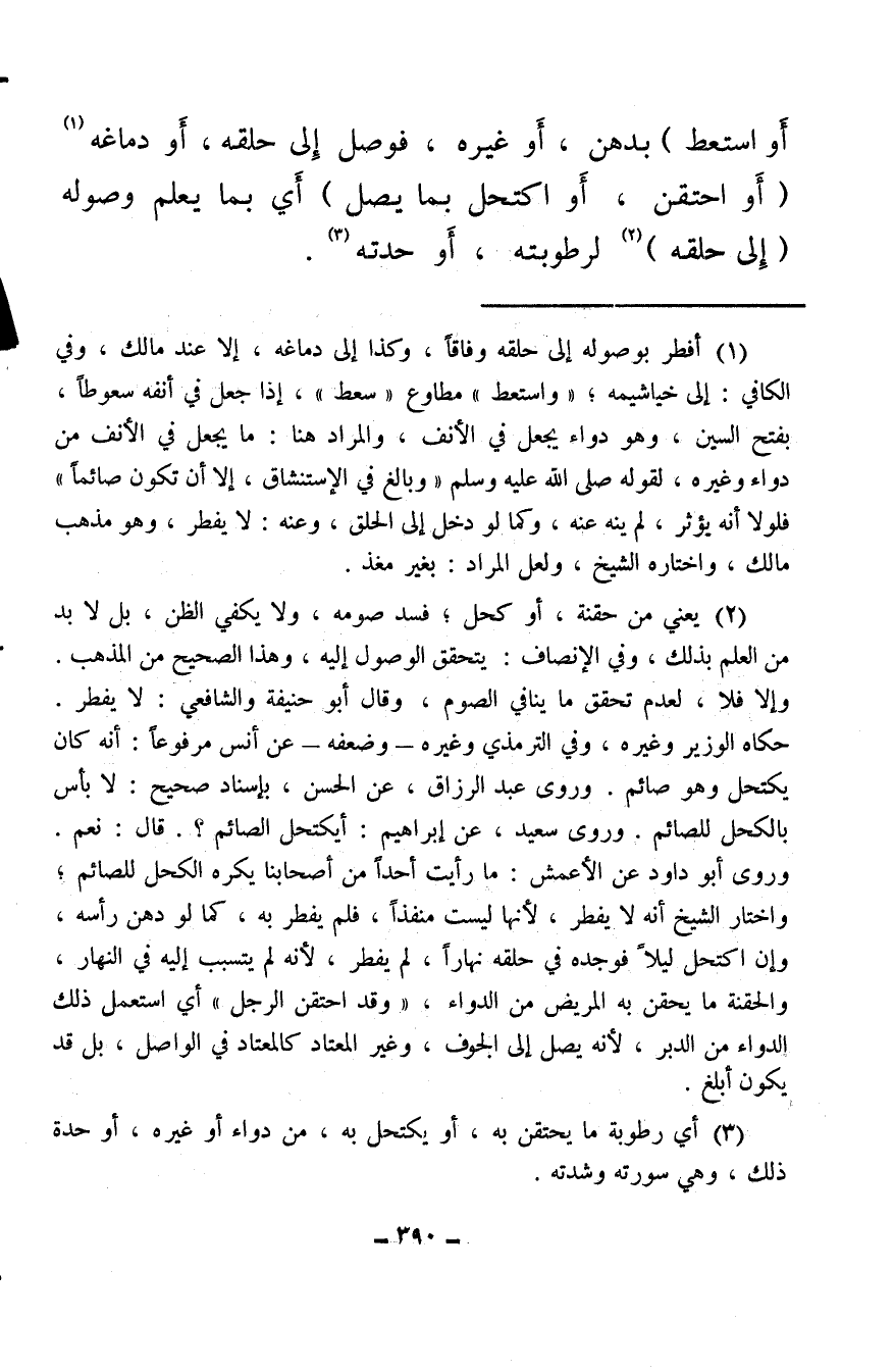 (¬2) يعني من حقنة، أو كحل؛ فسد صومه، ولا يكفي الظن، بل لا بد من العلم بذلك، وفي الإنصاف: يتحقق الوصول إليه، وهذا الصحيح من المذهب. وإلا فلا، لعدم تحقق ما ينافي الصوم، وقال أبو حنيفة والشافعي: لا يفطر. حكاه الوزير وغيره، وفي الترمذي وغيره – وضعفه – عن أنس مرفوعًا: أنه كان يكتحل وهو صائم. وروى عبد الرزاق، عن الحسن، بإسناد صحيح: لا بأس بالكحل للصائم. وروى سعيد، عن إبراهيم: أيكتحل الصائم؟. قال: نعم. وروى أبو داود عن الأعمش: ما رأيت أحدًا من أصحابنا يكره الكحل للصائم؛ واختار الشيخ أنه لا يفطر، لأنها ليست منفذًا، فلم يفطر به، كما لو دهن رأسه، وإن اكتحل ليلاً فوجده في حلقه نهارًا، لم يفطر، لأنه لم يتسبب إليه في النهار، والحقنة ما يحقن به المريض من الدواء، «وقد احتقن الرجل» أي استعمل ذلك الدواء من الدبر، لأنه يصل إلى الجوف، وغير المعتاد كالمعتاد في الواصل، بل قد يكون أبلغ.