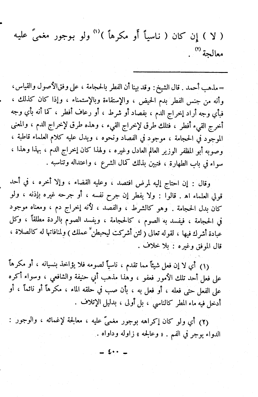 (¬1) أي لا إن فعل شيئًا مما تقدم، ناسيًا لصومه فلا يؤاخذ بنسيانه، أو مكرهًا على فعل أحد تلك الأمور فعفو، وهذا مذهب أبي حنيفة والشافعي، وسواء أكره على الفعل حتى فعله، أو فعل به، بأن صب في حلقه الماء، مكرهًا أو نائمًا، أو أدخل فيه ماء المطر كالناسي، بل أولى، بدليل الإتلاف.