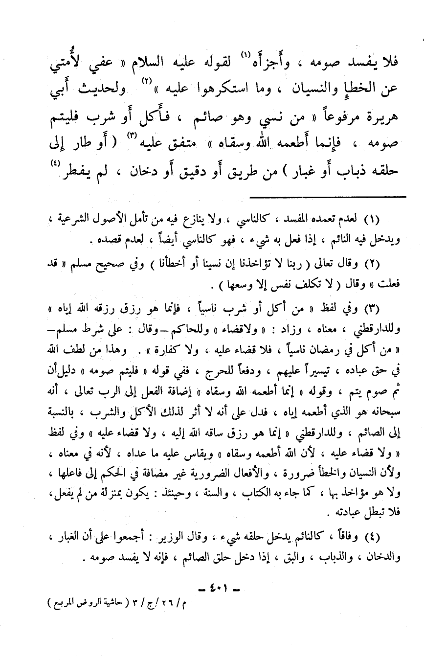 (¬4) وفاقًا، كالنائم يدخل حلقه شيء، وقال الوزير: أجمعوا على أن الغبار، والدخان، والذباب، والبق، إذا دخل حلق الصائم، فإنه لا يفسد صومه.
