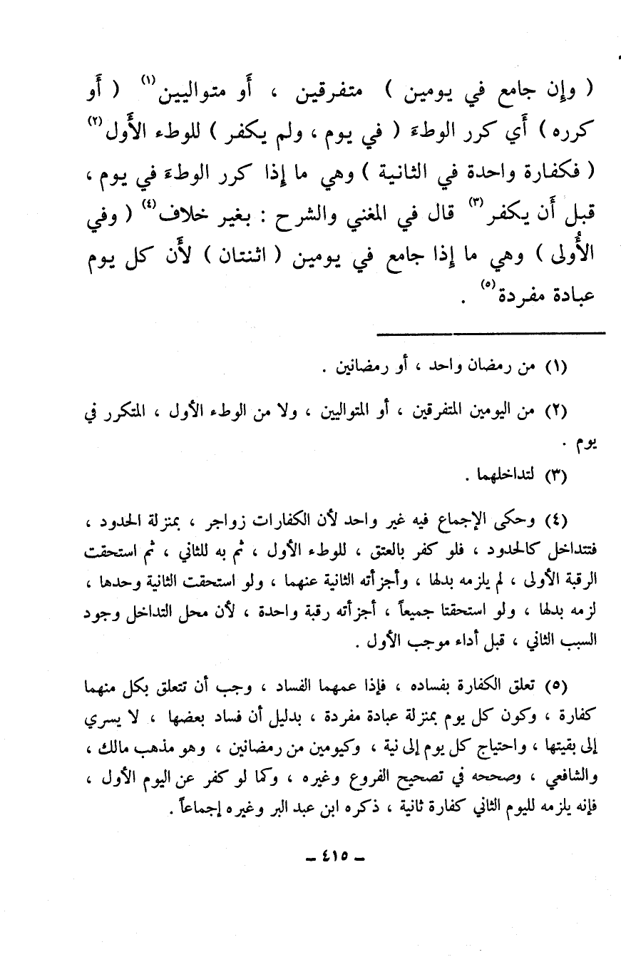 (¬5) تعلق الكفارة بفساده، فإذا عمهما الفساد، وجب أن تتعلق بكل منهما كفارة، وكون كل يوم بمنزلة عبادة مفردة، بدليل أن فساد بعضها، لا يسري إلى بقيتها، واحتياج كل يوم إلى نية، وكيومين من رمضانين، وهو مذهب مالك، والشافعي، وصححه في تصحيح الفروع وغيره، وكما لو كفر عن اليوم الأول، فإنه يلزمه لليوم الثاني كفارة ثانية، ذكره ابن عبد البر وغيره إجماعًا.
