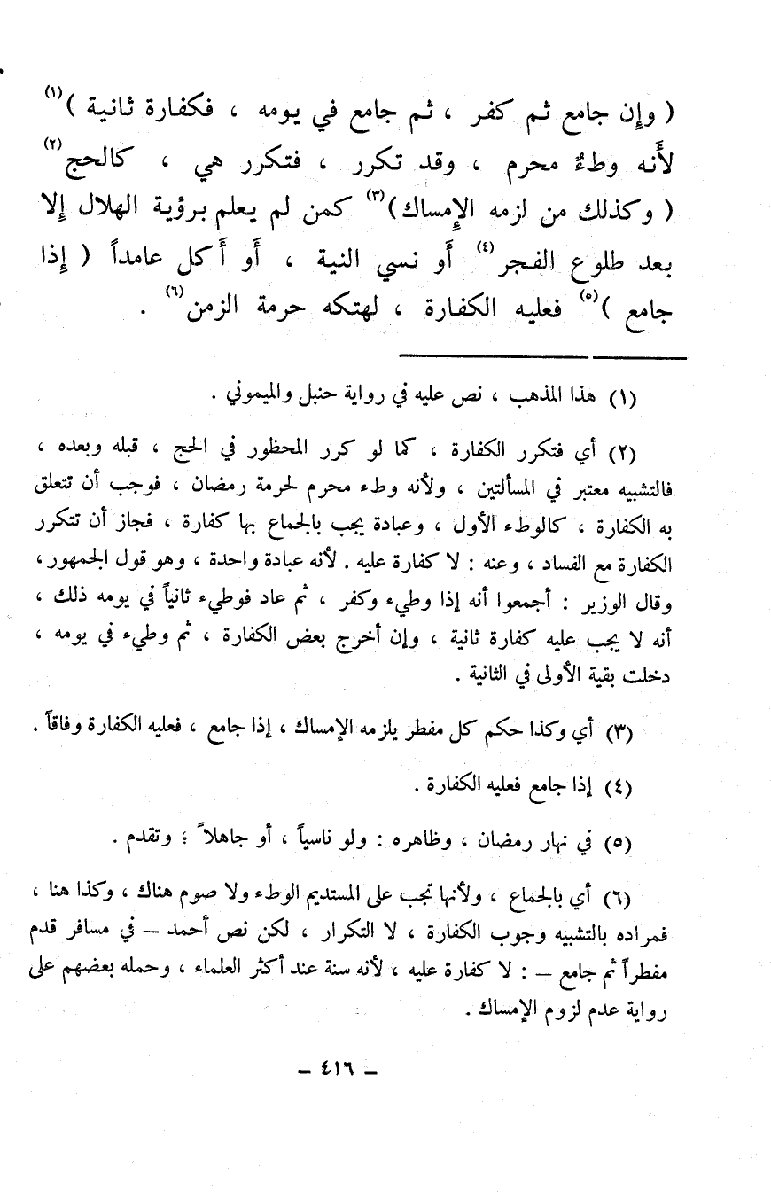 (¬6) أي بالجماع، ولأنها تجب على المستديم الوطء ولا صوم هناك، وكذا هنا، فمراده بالتشبيه وجوب الكفارة، لا التكرار، لكن نص أحمد – في مسافر قدم مفطرًا ثم جامع -: لا كفارة عليه، لأنه سنة عند أكثر العلماء، وحمله بعضهم على رواية عدم لزوم الإمساك.