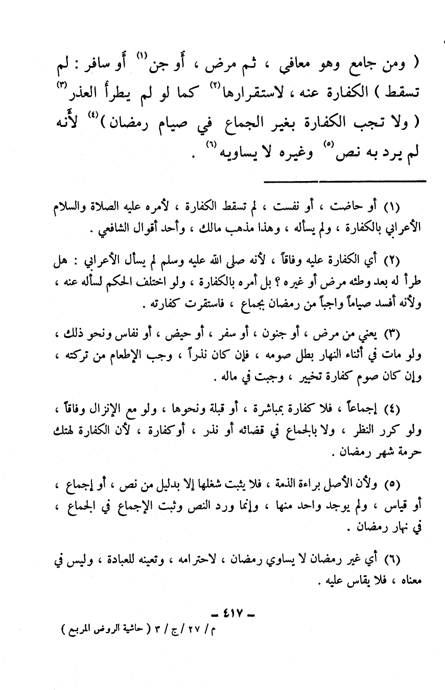 (¬3) يعني من مرض، أو جنون، أو سفر، أو حيض، أو نفاس ونحو ذلك، ولو مات في أثناء النهار بطل صومه، فإن كان نذرًا، وجب الإطعام من تركته، وإن كان صوم كفارة تخيير، وجبت في ماله.