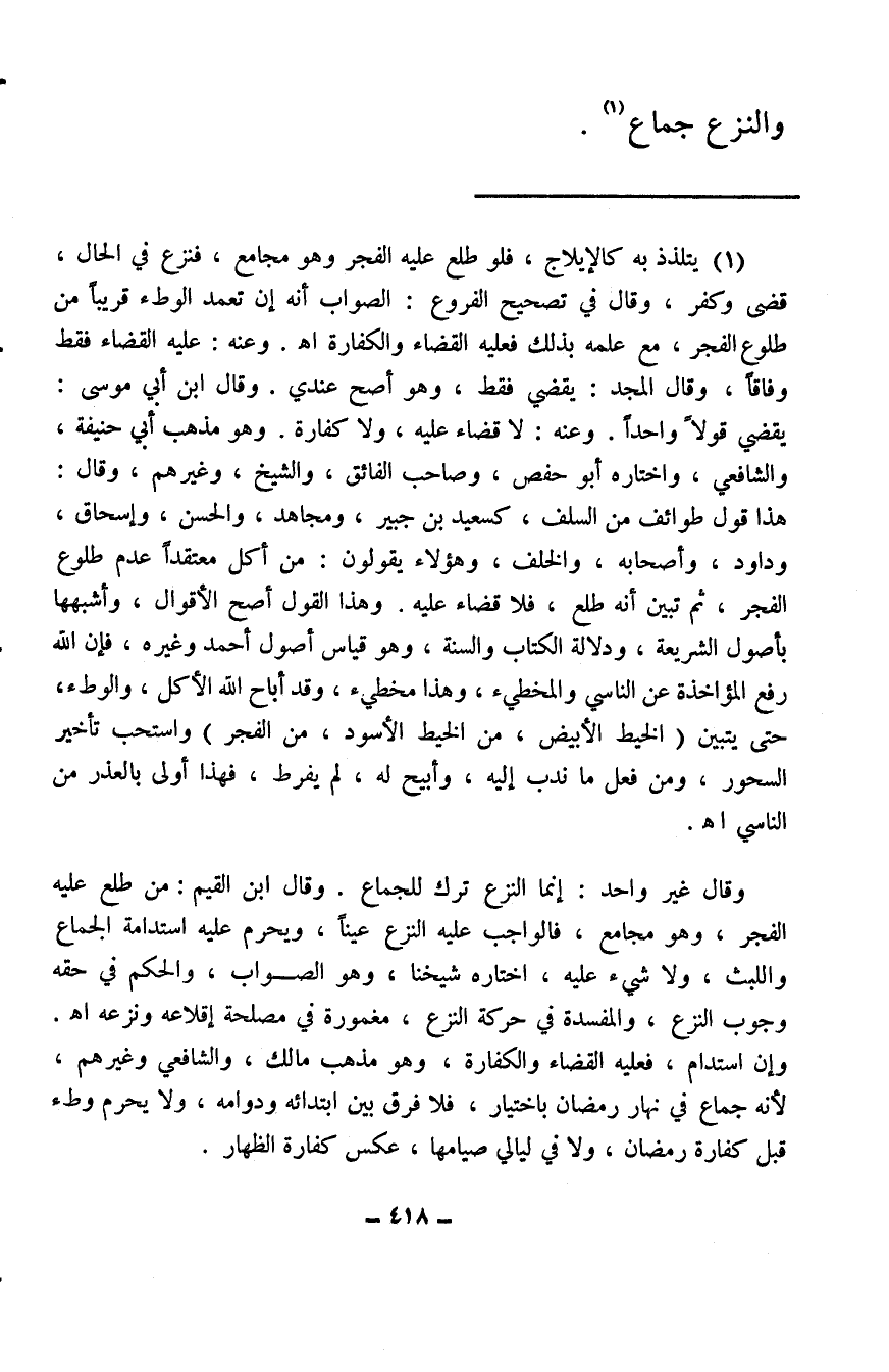 وقال غير واحد: إنما النزع ترك للجماع. وقال ابن القيم: من طلع عليه الفجر، وهو مجامع، فالواجب عليه النزع عينًا، ويحرم عليه استدامة الجماع واللبث، ولا شيء عليه، اختاره شيخنا، وهو الصواب، والحكم في حقه وجوب النزع، والمفسدة في حركة النزع، مغمورة في مصلحة إقلاعه ونزعه. اهـ. وإن استدام، فعليه القضاء والكفارة، وهو مذهب مالك، والشافعي وغيرهم، لأنه جماع في نهار رمضان باختيار، فلا فرق بين ابتدائه ودوامه، ولا يحرم وطء قبل كفارة رمضان، ولا في ليالي صيامها، عكس كفارة الظهار.