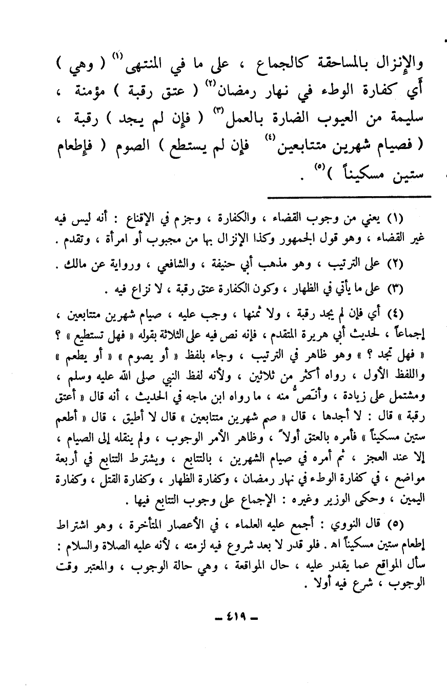 والإنزال بالمساحقة كالجماع، على ما في المنتهى (¬1) (وهي) أي كفارة الوطء في نهار رمضان (¬2) (عتق رقبة) مؤمنة، سليمة من العيوب الضارة بالعمل (¬3) (فإن لم يجد) رقبة، (فصيام شهرين متتابعين (¬4) فإن لم يستطع) الصوم (فإطعام ستين مسكينًا) (¬5) .