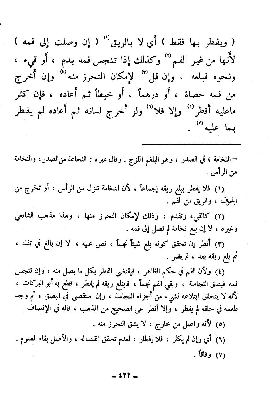 (¬4) ولأن الفم في حكم الظاهر، فيقتضي الفطر بكل ما يصل منه، وإن تنجس فمه فبصق النجاسة، وبقي الفم نجسًا، فابتلع ريقه لم يفطر، قطع به أبو البركات، لأنه لا يتحقق ابتلاعه لشيء من أجزاء النجاسة، وإن استقصى في البصق، ثم وجد طعمه في حلقه لم يفطر، وإلا أفطر على الصحيح من المذهب، قاله في الإنصاف.