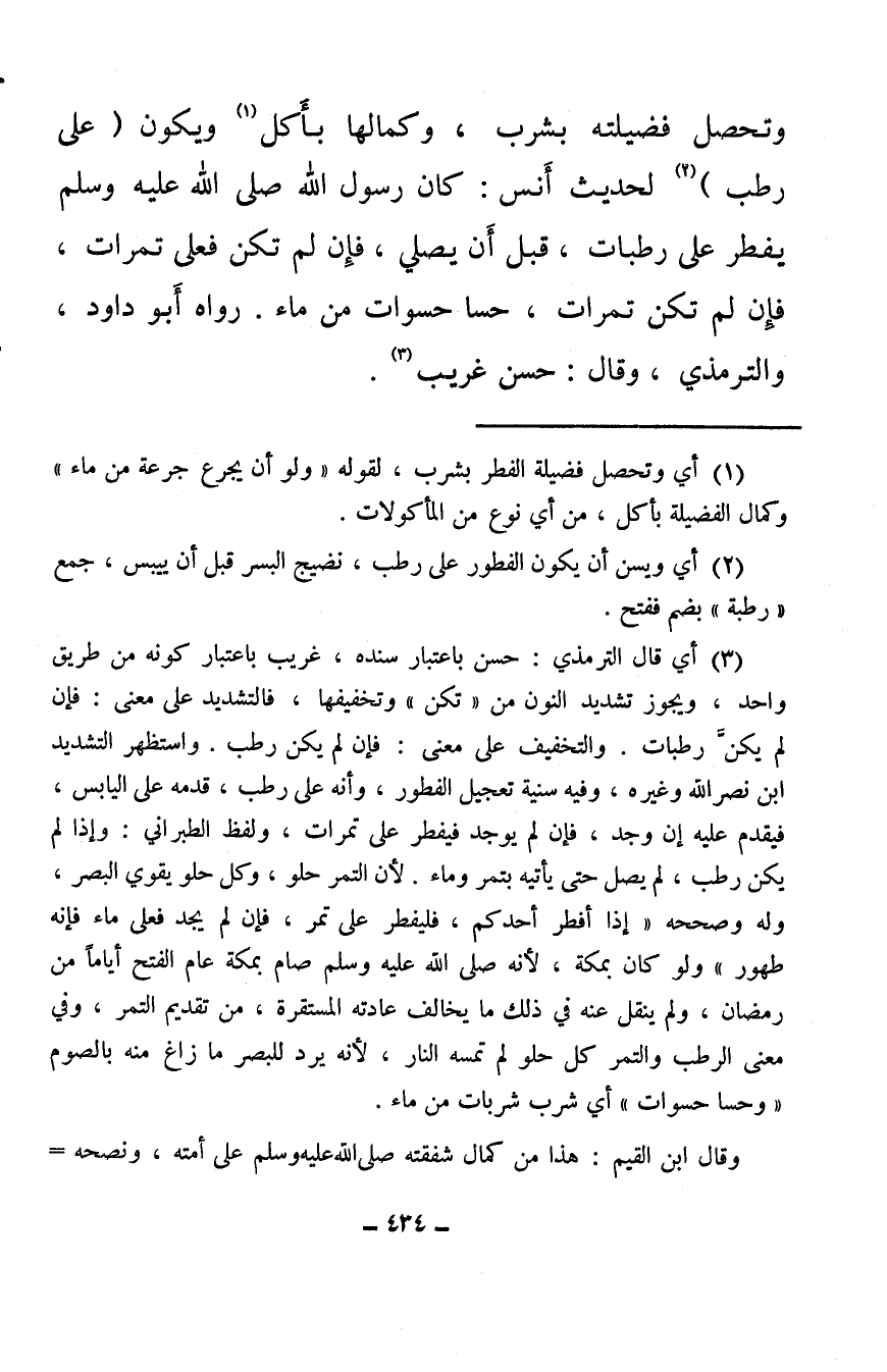 (¬3) أي قال الترمذي: حسن باعتبار سنده، غريب باعتبار كونه من طريق واحد، ويجوز تشديد النون من «تكن» وتخفيفها، فالتشديد على معنى: فإن لم يكنَّ رطبات. والتخفيف على معنى: فإن لم يكن رطب. واستظهر التشديد ابن نصر الله وغيره، وفيه سنية تعجيل الفطور، وأنه على رطب، قدمه على اليابس، فيقدم عليه إن وجد، فإن لم يوجد فيفطر على تمرات، ولفظ الطبراني: وإذا لم يكن رطب، لم يصل حتى يأتيه بتمر وماء. لأن التمر حلو، وكل حلو يقوي البصر، وله وصححه «إذا أفطر أحدكم، فليفطر على تمر، فإن لم يجد فعلى ماء فإنه طهور» ولو كان بمكة، لأنه صلى الله عليه وسلم صام بمكة عام الفتح أيامًا من رمضان، ولم ينقل عنه في ذلك ما يخالف عادته المستقرة، من تقديم التمر، وفي معنى الرطب والتمر كل حلو لم تمسه النار، لأنه يرد للبصر ما زاغ منه بالصوم «وحسا حسوات» أي شرب شربات من ماء.