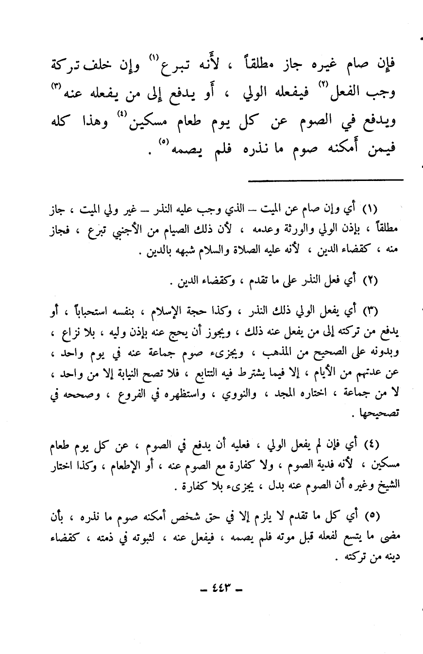 (¬1) أي وإن صام عن الميت – الذي وجب عليه النذر – غير ولي الميت، جاز مطلقًا، بإذن الولي والورثة وعدمه، لأن ذلك الصيام من الأجنبي تبرع، فجاز منه، كقضاء الدين، لأنه عليه الصلاة والسلام شبهه بالدين.
