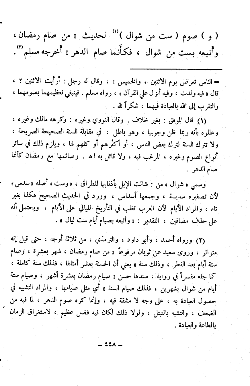 (¬2) ورواه أحمد، وأبو داود، والترمذي، من ثلاثة أوجه، حتى قيل إنه متواتر، وروى سعيد عن ثوبان مرفوعًا «من صام رمضان، شهر بعشرة، وصام ستة أيام بعد الفطر، وذلك سنة» يعني أن الحسنة بعشر أمثالها، فذلك سنة كاملة، كما جاء مفسرًا في رواية، سندها حسن «صيام رمضان بعشرة أشهر، وصيام ستة أيام من شوال بشهرين، فذلك صيام السنة» أي مثل صيامها، والمراد التشبيه في حصول العبادة به، على وجه لا مشقة فيه، وإنما كره صوم الدهر، لما فيه من الضعف، والتشبه بالتبتل، ولولا ذلك لكان فيه فضل عظيم، لاستغراق الزمان بالطاعة والعبادة.
