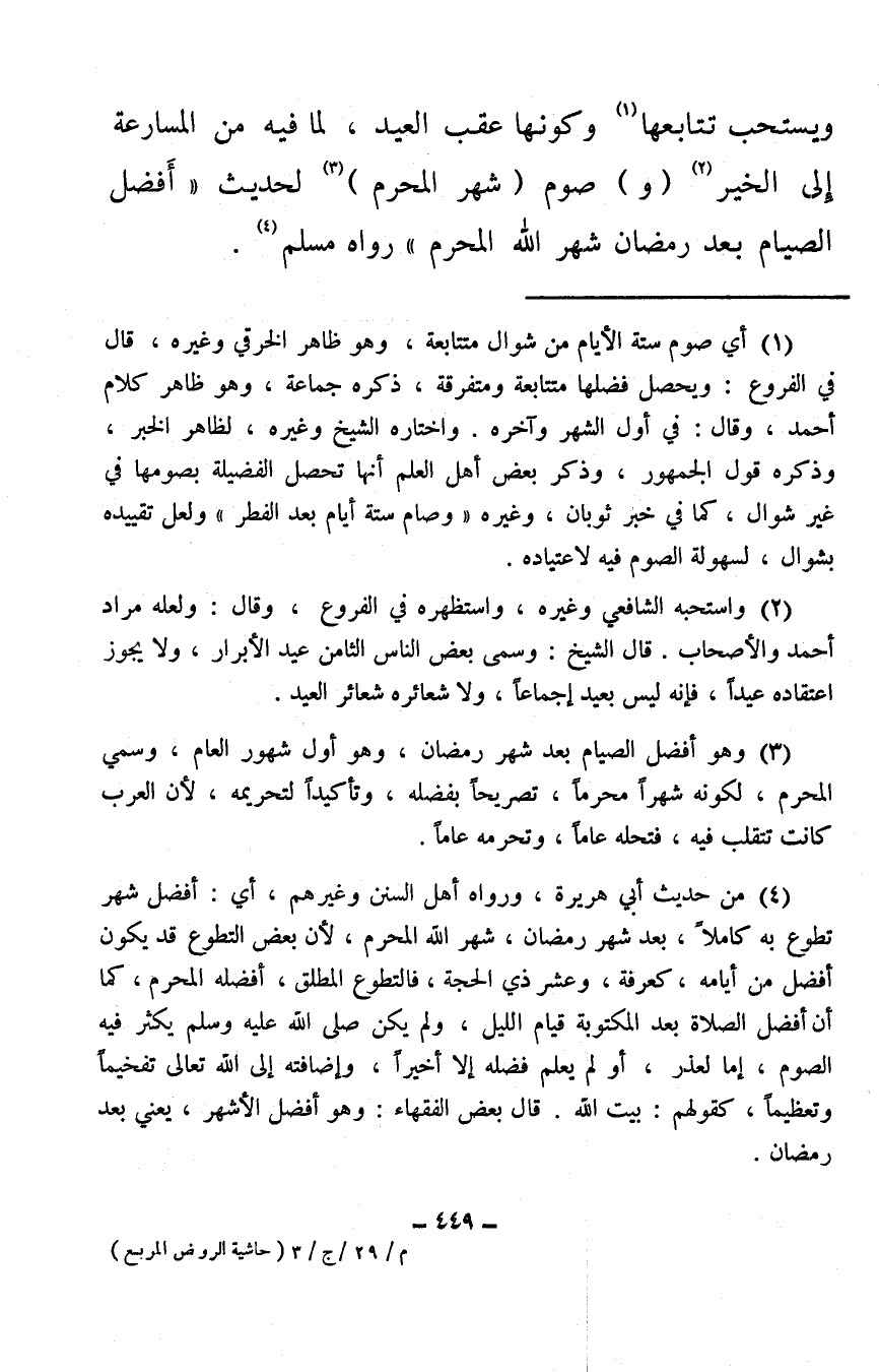 (¬4) من حديث أبي هريرة، ورواه أهل السنن وغيرهم، أي: أفضل شهر تطوع به كاملاً، بعد شهر رمضان، شهر الله المحرم، لأن بعض التطوع قد يكون أفضل من أيامه، كعرفة، وعشر ذي الحجة، فالتطوع المطلق، أفضله المحرم، كما أن أفضل الصلاة بعد المكتوبة قيام الليل، ولم يكن صلى الله عليه وسلم يكثر فيه الصوم، إما لعذر، أو لم يعلم فضله إلا أخيرًا، وإضافته إلى الله تعالى تفخيمًا وتعظيمًا، كقولهم: بيت الله. قال بعض الفقهاء: وهو أفضل الأشهر، يعني بعد رمضان.