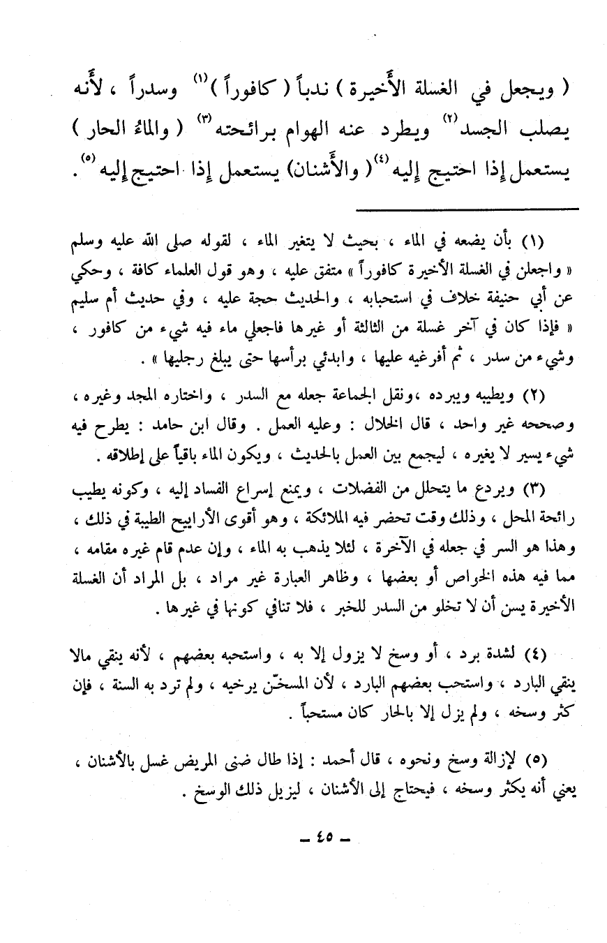 (ويجعل في الغسلة الأخيرة) ندبًا (كافورًا) (¬1) وسدرًا، لأنه يصلب الجسد (¬2) ويطرد عنه الهوام برائحته (¬3) (والماءُ الحار) يستعمل إذا احتيج إليه (¬4) (والأشنان) يستعمل إذا احتيج إليه (¬5) .
