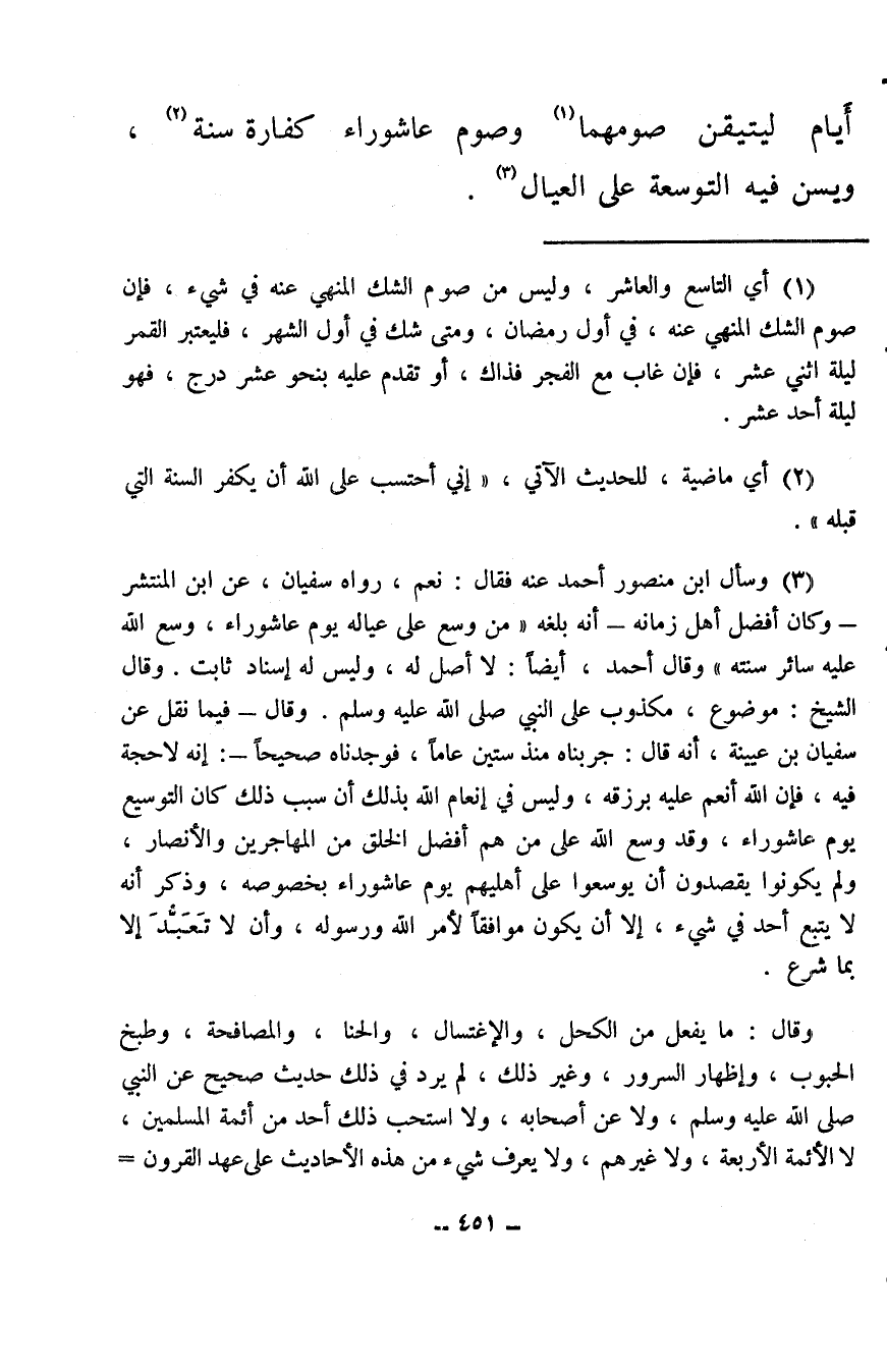 وقال: ما يفعل من الكحل، والاغتسال، والحنا، والمصافحة، وطبخ الحبوب، وإظهار السرور، وغير ذلك، لم يرد في ذلك حديث صحيح عن النبي صلى الله عليه وسلم، ولا عن أصحابه، ولا استحب ذلك أحد من أئمة المسلمين، لا الأئمة الأربعة، ولا غيرهم، ولا يعرف شيء من هذه الأحاديث على عهد القرون الفاضلة، بل من البدع التي لم يسنها رسول الله صلى الله عليه وسلم، ولا خلفاؤه، وإن كان يورد بعض أتباع الأئمة فيها آثارًا، ويقولون: إن بعض ذلك صحيح. فهم مخطئون، غالطون بلا ريب، عند أهل المعرفة بحقائق الأمور. وقال: وقوم يستحبون الاكتحال، والاغتسال، والتوسعة على العيال، واتخاذ أطعمة غير معتادة، وهو بدعة، وأصلها من المتعصبين بالباطل على الحسين رضي الله عنه، «وكل بدعة ضلالة» ولم يستحب ذلك أحد من الأئمة الأربعة، ولا غيرهم، ولا عند من استحب ذلك حجة شرعية، بل المستحب يوم عاشوراء الصيام، عند جمهور أهل العلم.