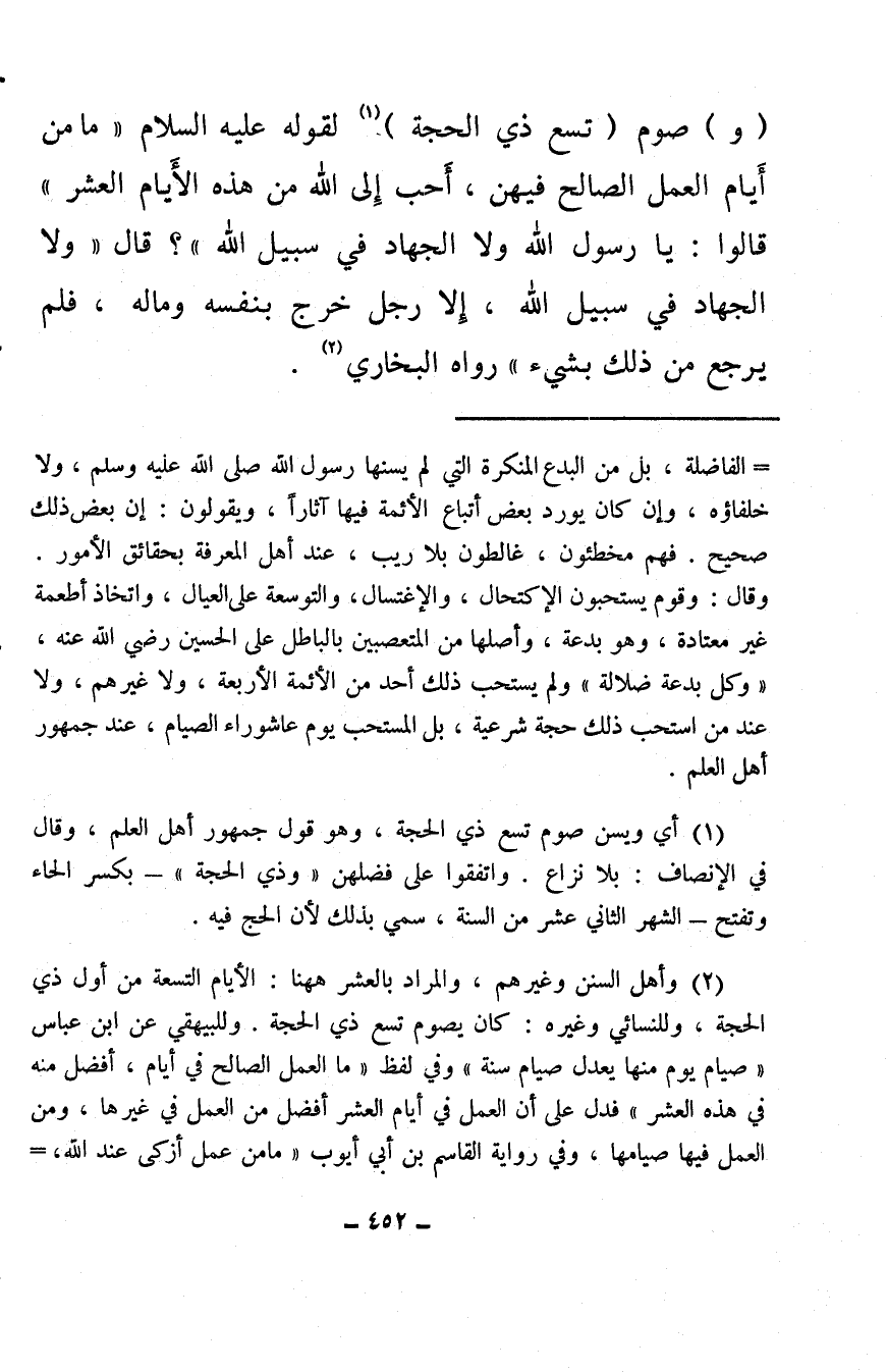 قال الشيخ: وهو الأظهر. وهن الأيام المعلومات، في قول أكثر أهل العلم، وأكثر المفسرين في قوله {وَيَذْكُرُوا اسْمَ اللهِ فِي أَيَّامٍ مَعْلُومَاتٍ} سميت بذلك للحرص على علمها بحسابها، من أجل وقت الحج في آخرها، وآخرهن يوم النحر، في قول أكثر أهل العلم، وإنما سميت التسع عشرًا من إطلاق الكل على الأكثر، لأن العاشر لا يصام، فإطلاق العشر تغليبًا، وفيه فضل الجهاد، ويأتي إن شاء الله تعالى، وقوله «إلا رجل» لأكثر رواه البخاري أي: إلا عمل رجل. وللمستملي «إلا من خرج بماله ونفسه، فلم يرجع من ذلك بشيء» أي فيكون من لم يرجع بشيء من ذلك أفضل من العامل في أيام العشر، أو مساويًا له، فدل على فضيلة أيام العشر على غيرها من السنة، وتخصيصها بهذه المزاياـ والعمل فيها لا ينحصر.
