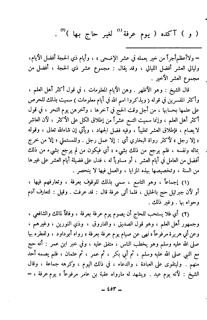 (¬2) أي فلا يستحب للحاج أن يصوم يوم عرفة بعرفة، وفاقًا لمالك والشافعي، وجمهور أهل العلم، وهو قول الصديق، والفاروق، وذي النورين، وغيرهم، وعن أبي هريرة مرفوعًا «نهى عن صيام يوم عرفة بعرفة» رواه أبو داود، ولفطره بها صلى الله عليه وسلم وهو يخطب الناس، متفق عليه، وفي خبر ابن عمر: أنه حج مع النبي صلى الله عليه وسلم، ثم أبي بكر، ثم عمر، ثم عثمان، فلم يصمه أحد منهم. وليتقوى على العبادة، والدعاء، في ذلك اليوم، وكرهه جماعة، وقال الشيخ: لأنه يوم عيد. ويشهد له ما رواه عقبة بن عامر مرفوعًا «يوم عرفة، ويوم النحر، وأيام التشريق، عيدنا أهل الإسلام، وهي أيام أكل، وشرب، وذكر لله» رواه الخمسة إلا ابن ماجه، وصححه الترمذي، قال المجد وغيره: والمراد إلا المتمتع والقارن عدما الهدي، فيستحب أن يجعل آخر صيام الثلاثة يوم عرفة ويأتي.