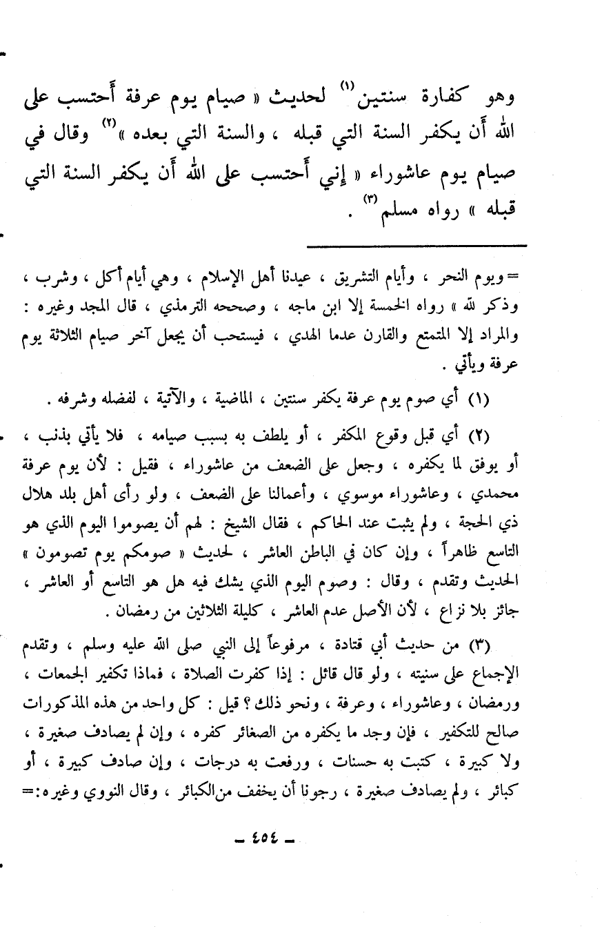 (¬2) أي قبل وقوع المكفر، أو يلطف به بسبب صيامه، فلا يأتي بذنب، أو يوفق لما يكفره، وجعل على الضعف من عاشوراء، فقيل: لأن يوم عرفة محمدي، وعاشوراء موسوي، وأعمالنا على الضعف، ولو رأى أهل بلد هلال ذي الحجة، ولم يثبت عند الحاكم، فقال الشيخ: لهم أن يصوموا اليوم الذي هو التاسع ظاهرًا، وإن كان في الباطن العاشر، لحديث «صومكم يوم تصومون» الحديث وتقدم، وقال: وصوم اليوم الذي يشك فيه هل هو التاسع أو العاشر، جائز بلا نزاع، لأن الأصل عدم العاشر، كليلة الثلاثين من رمضان.