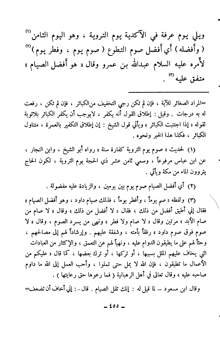 (¬1) لحديث «صوم يوم التروية كفارة سنة» رواه أبو الشيخ، وابن النجار، عن ابن عباس مرفوعًا، وسمي ثامن عشر ذي الحجة يوم التروية، لكون الحاج يتروون الماء من مكة ويأتي.