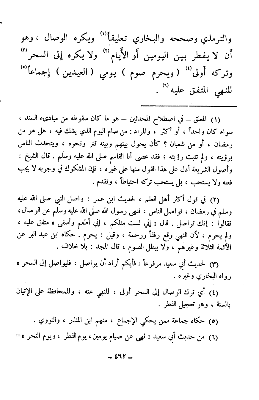 والترمذي وصححه البخاري تعليقًا (¬1) ويكره الوصال، وهو أَن لا يفطر بين اليومين أو الأيام (¬2) ولا يكره إلى السحر (¬3) وتركه أولى (¬4) (ويحرم صوم) يومي (العيدين) إجماعًا (¬5) للنهي المتفق عليه (¬6) .