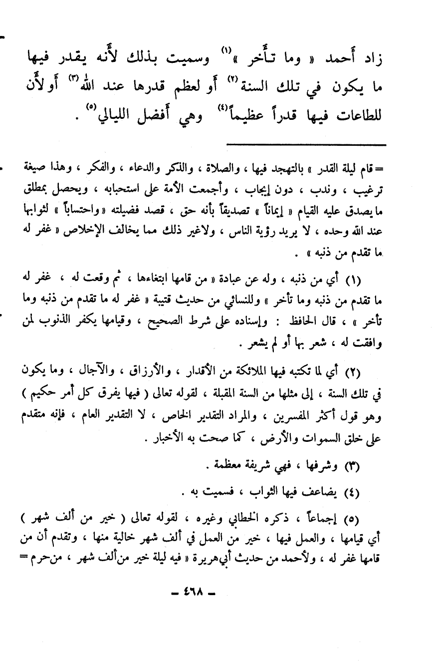 زاد أحمد «وما تأخر» (¬1) وسميت بذلك لأنه يقدر فيها ما يكون في تلك السنة (¬2) أو لعظم قدرها عند الله (¬3) أو لأن للطاعات فيها قدرًا عظيمًا (¬4) وهي أفضل الليالي (¬5) .