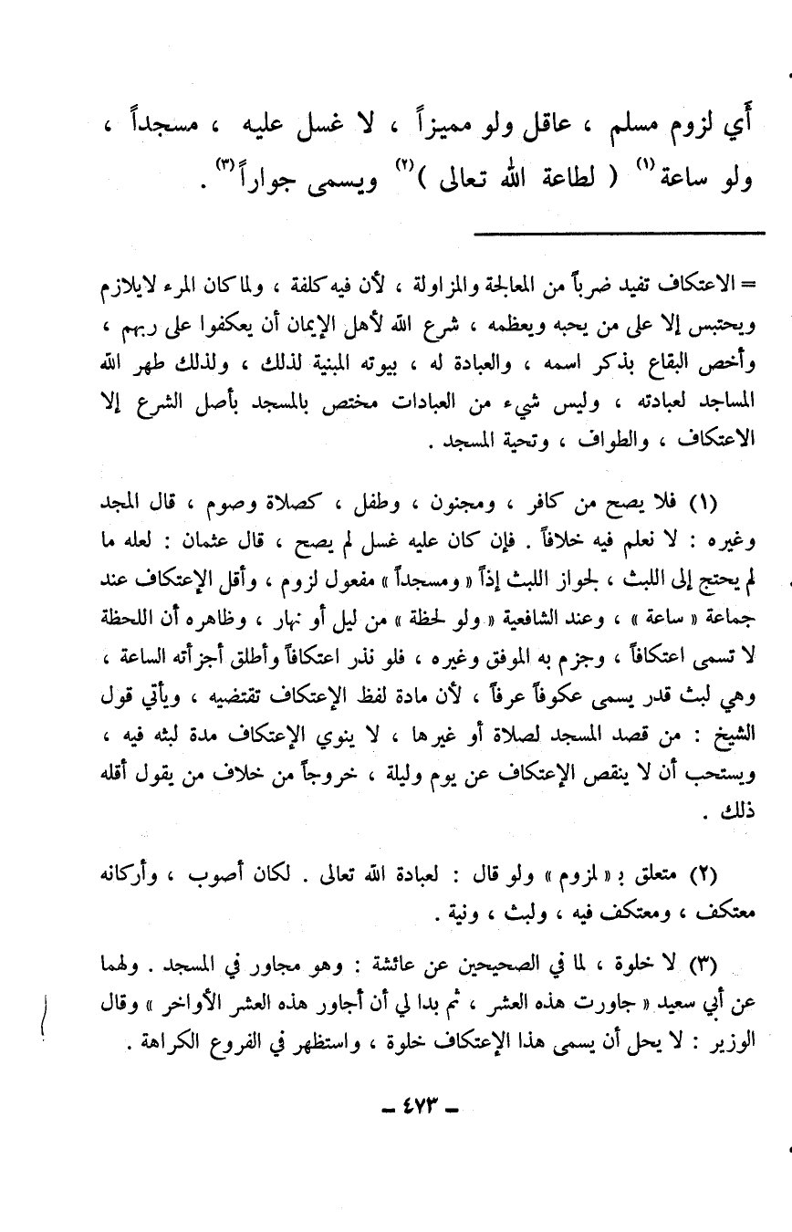 (¬1) فلا يصح من كافر، ومجنون، وطفل، كصلاة وصوم، قال المجد وغيره: لا نعلم فيه خلافًا. فإن كان عليه غسل لم يصح، قال عثمان: لعله ما لم يحتج إلى الليث، لجواز الليث إذًا «ومسجدًا» مفعول لزوم، وأقل الاعتكاف عند جماعة «ساعة» ، وعند الشافعية «ولو لحظة» من ليل أو نهار، وظاهره أن اللحظة لا تسمى اعتكافًا، وجزم به الموفق وغيره، فلو نذر اعتكافًا وأطلق أجزأته الساعة، , وهي لبث قدر يسمى عكوفًا عرفًا، لأن مادة لفظ الاعتكاف تقتضيه، ويأتي قول الشيخ: من قصد المسجد لصلاة أو غيرها، لا ينوي الاعتكاف مدة لبثه فيه، ويستحب أن لا ينقص الاعتكاف عن يوم وليلة، خروجًا من خلاف من يقول أقله ذلك.