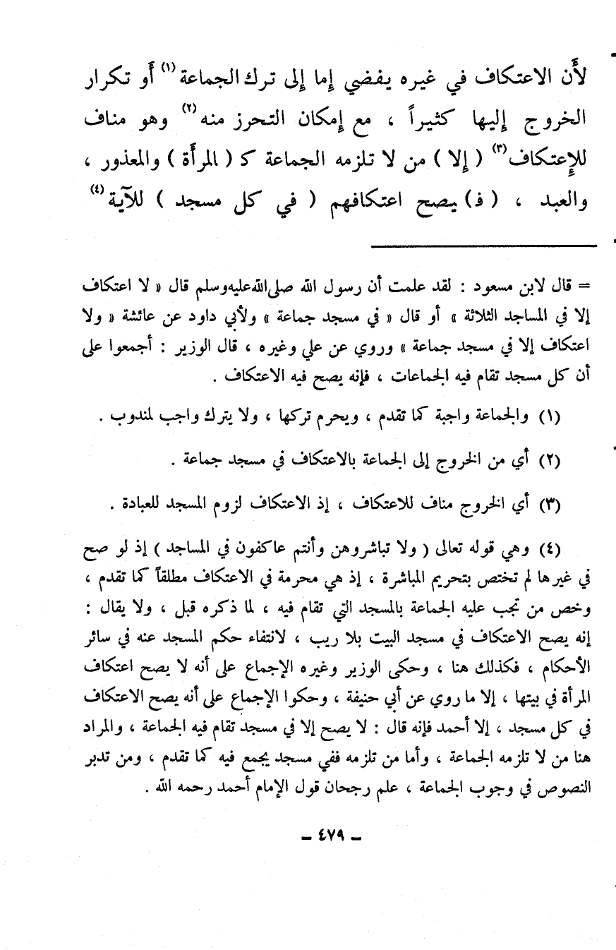 (¬4) وهي قوله تعالى {وَلا تُبَاشِرُوهُنَّ وَأَنْتُمْ عَاكِفُونَ فِي الْمَسَاجِدِ} إذ لو صح في غيرها لم تختص بتحريم المباشرة، إذ هي محرمة في الاعتكاف مطلقًا كما تقدم، وخص من تجب عليه الجماعة بالمسجد التي تقام فيه، لما ذكره قبل، ولا يقال: إنه يصح الاعتكاف في مسجد البيت بلا ريب، لانتفاء حكم المسجد عنه في سائر الأحكام، فكذلك هنا، وحكى الوزير وغيره الإجماع على أنه لا يصح اعتكاف المرأة في بيتها، إلا ما روي عن أبي حنيفة، وحكوا الإجماع على أنه يصح الاعتكاف في كل مسجد، إلا أحمد فإنه قال: لا يصح إلا في مسجد تقام فيه الجماعة، والمراد هنا من تلزمه الجماعة، وأما من تلزمه ففي مسجد يجمع فيه كما تقدم، ومن تدبر النصوص في وجوب الجماعة، علم رجحان قول الإمام أحمد رحمه الله.