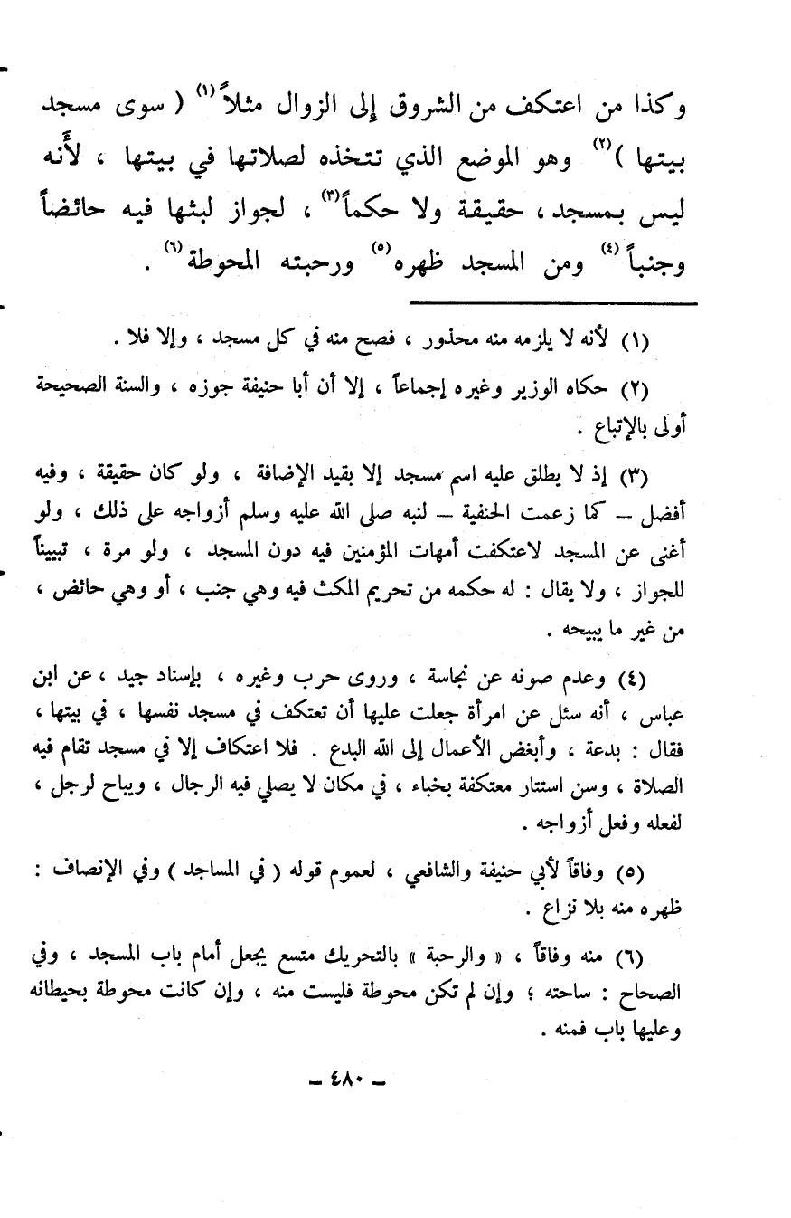 (¬4) وعدم صونه عن نجاسة، وروى حرب وغيره، بإسناد جيد، عن ابن عباس، أنه سئل عن امرأة جعلت عليها أن تعتكف في مسجد نفسها، في بيتها، فقال: بدعة، وأبغض الأعمال إلى الله البدع. فلا اعتكاف إلا في مسجد تقام فيه الصلاة، وسن استتار معتكفة بخباء، في مكان لا يصلي فيه الرجال، ويباح لرجل، لفعله وفعل أزواجه.