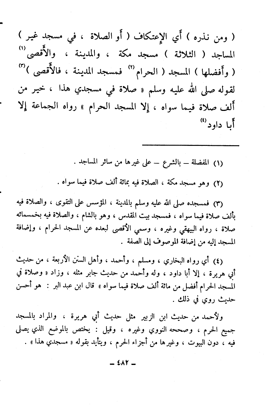 (¬4) أي رواه البخاري، ومسلم، وأحمد، وأهل السنن الأربعة، من حديث أبي هريرة، إلا أبا داود، وله وأحمد من حديث جابر مثله، وزاد «وصلاة في المسجد الحرام أفضل من مائة ألف صلاة فيما سواه» قال ابن عبد البر: هو أحسن حديث روي في ذلك.
