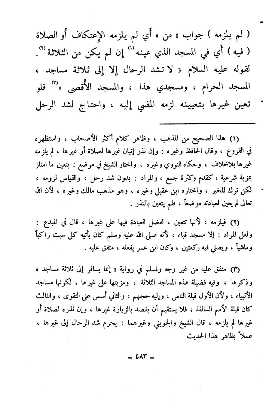 (¬3) متفق عليه من غير وجه ولمسلم في رواية «إنما يسافر إلى ثلاثة مساجد» وذكرها، وفيه فضيلة هذه المساجد الثلاثة، ومزيتها على غيرها، لكونها مساجد الأنبياء، ولأن الأول قبلة الناس، وإليه حجهم، والثاني أسس على التقوى، والثالث كان قبلة الأمم السالفة فلا يستقيم أن يقصد بالزيارة غيرها، وإن نذره لصلاة أو غيرها لم يلزمه، قال الشيخ والجويني وغيرهما: يحرم شد الرحال إلى غيرها، عملاً بظاهر هذا الحديث.